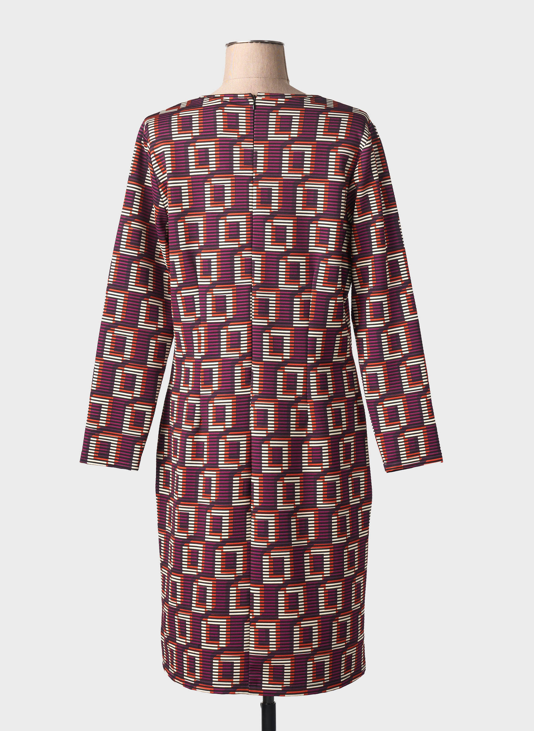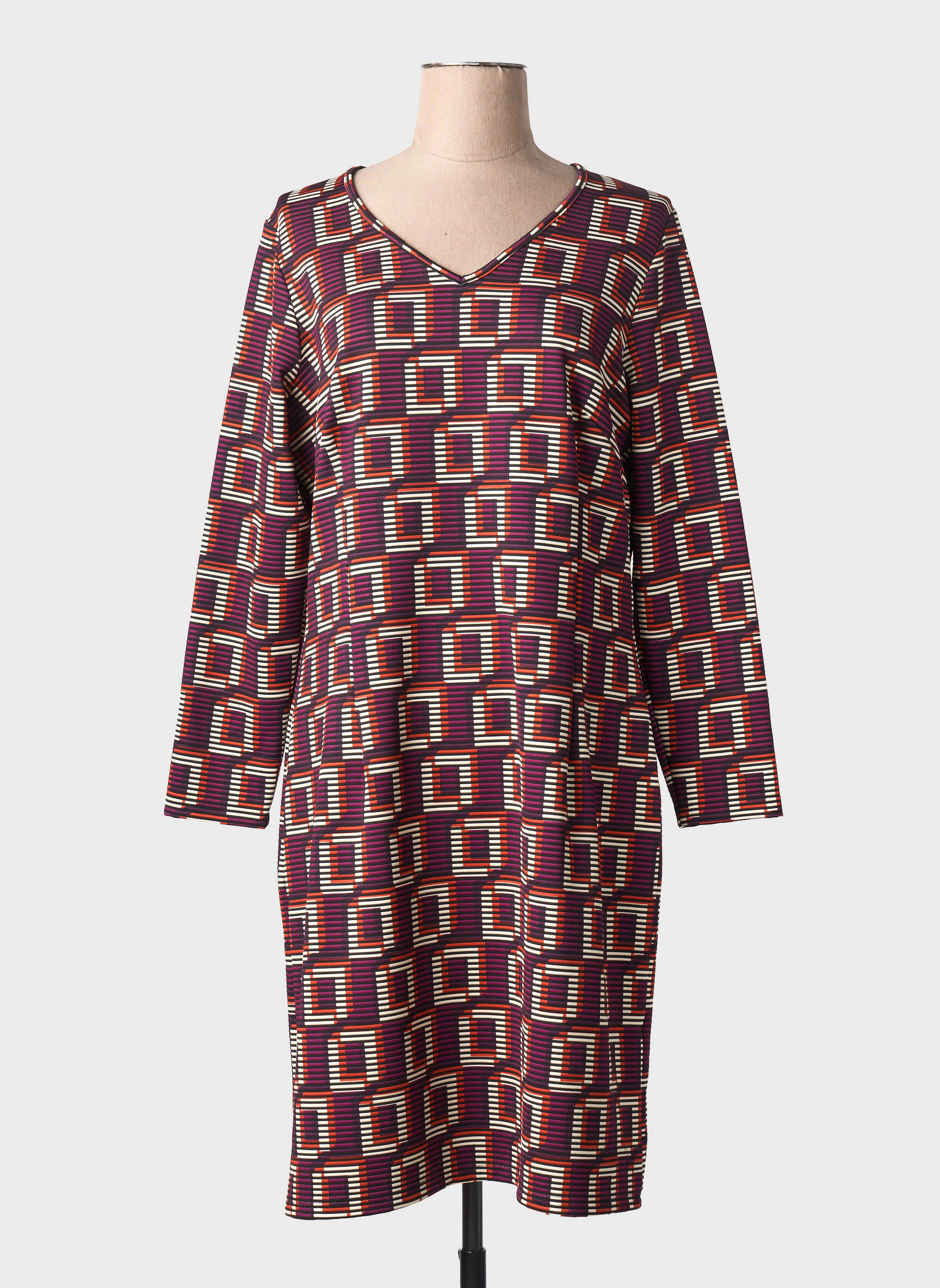 Profitez d'une opportunité unique avec cette robe mi-longue MERI & ESCA pour femme, parfaite pour ajouter une touche graphique à votre dressing sans vous ruiner. Son imprimé géométrique original sur fond bordeaux attire immédiatement le regard, tandis que la coupe droite et le col en V offrent une silhouette flatteuse et facile à porter au quotidien comme en soirée. C'est le bon plan à saisir pour allier style, confort et économies.