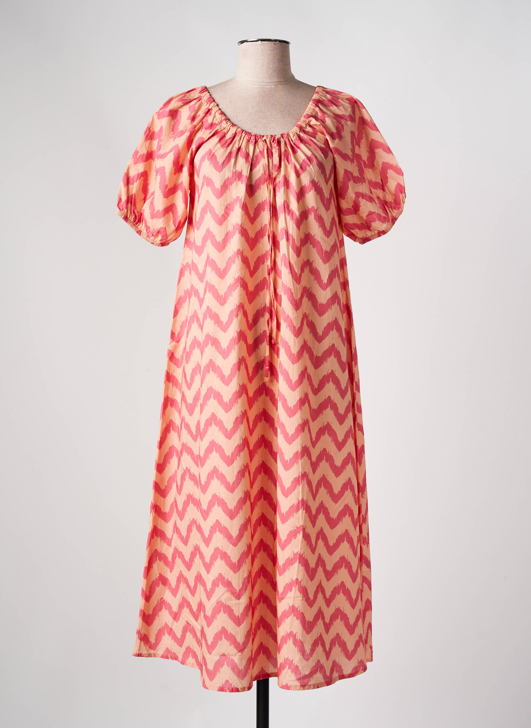Faites-vous plaisir sans vous ruiner avec cette robe mi-longue signée MUS & BOMBON qui allie tendance et petit prix, parfaite pour dynamiser votre garde-robe de saison. Son imprimé chevron rose et beige apporte une touche graphique pleine de fraîcheur, tandis que ses manches courtes bouffantes et son encolure légèrement froncée offrent une silhouette féminine et décontractée, idéale pour tous les jours comme pour les escapades estivales.