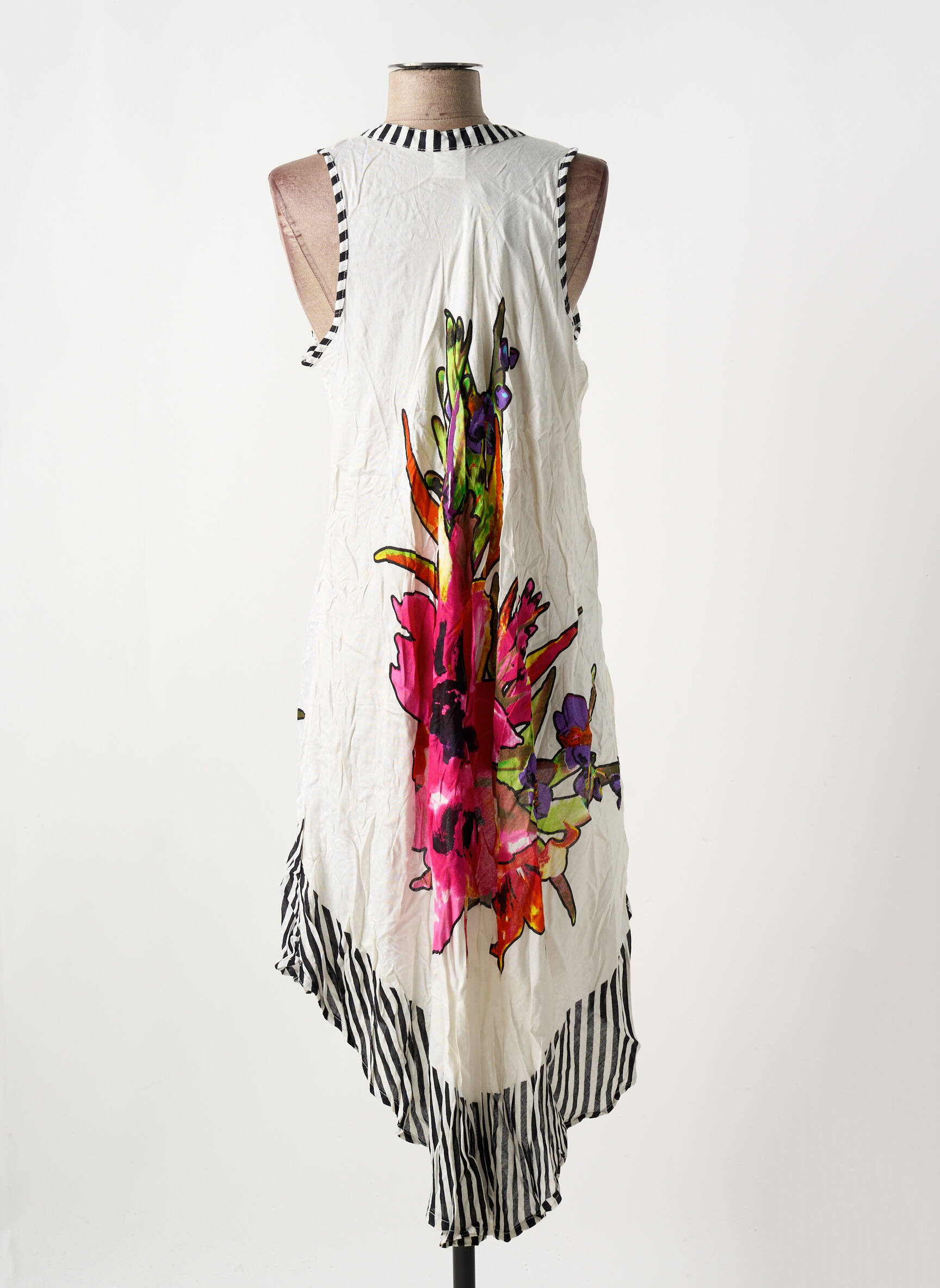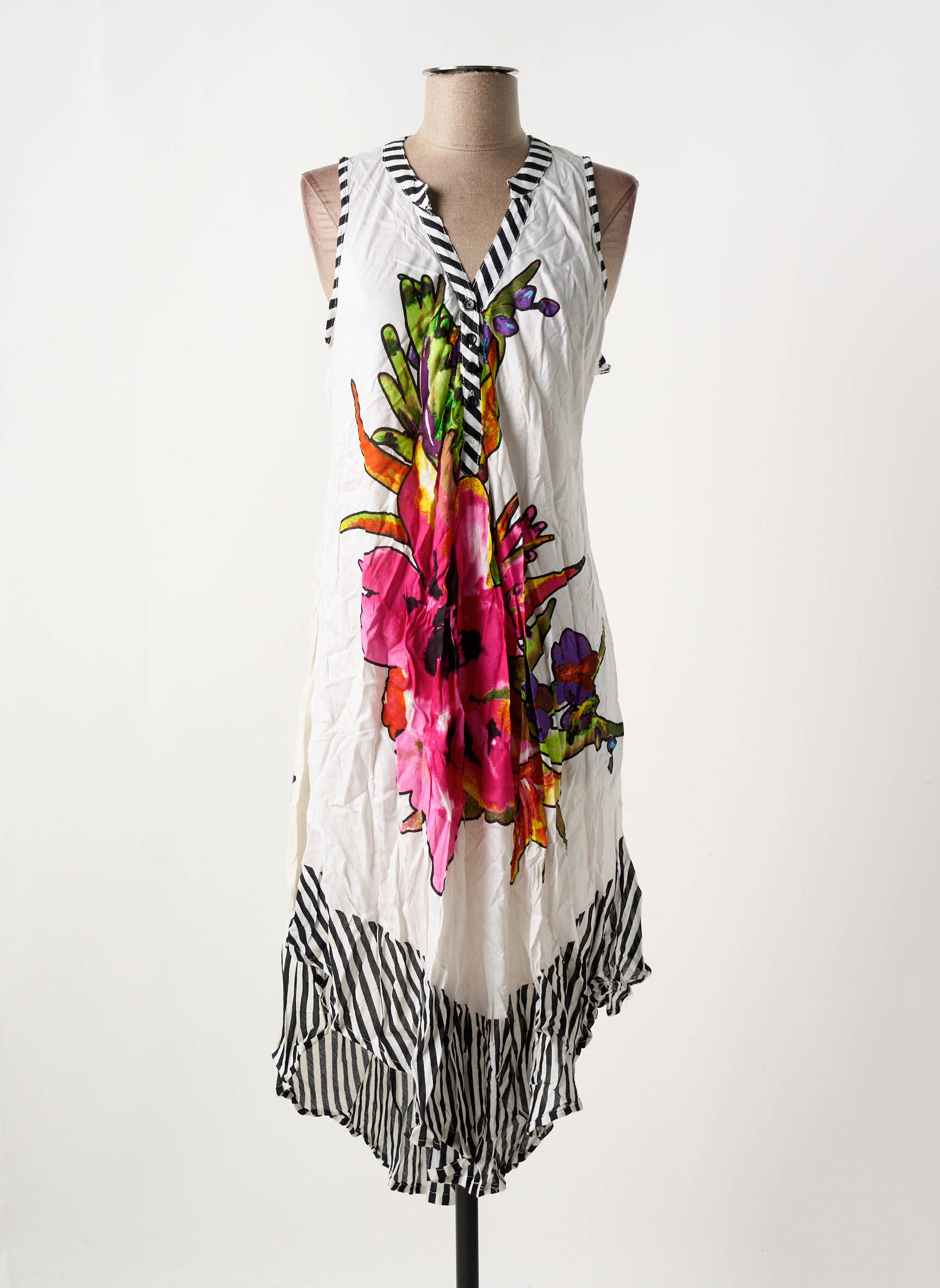 Laissez-vous séduire par cette robe mi-longue de la marque NICE DAY, une pièce originale et colorée à prix tout doux idéale pour renouveler votre garde-robe sans vous ruiner. Son imprimé floral éclatant au centre rehausse délicatement la silhouette, tandis que les bandes rayées noires et blanches à la base et sur l’encolure ajoutent une touche graphique très tendance. Facile à porter tous les jours, ce modèle sans manches et à col en V flatte la silhouette pour un look frais, féminin et ultra accessible.