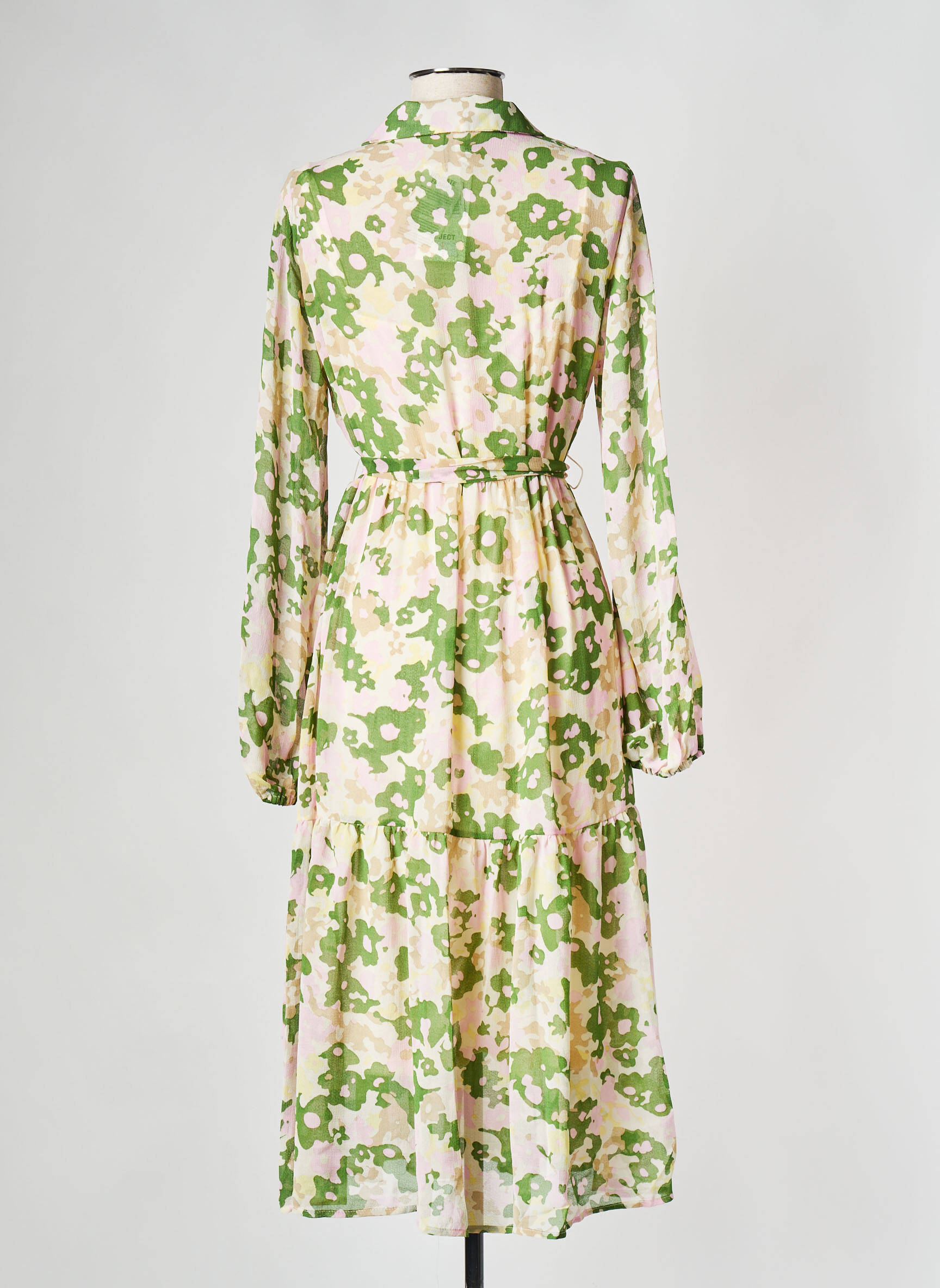 Imaginez une promenade en forêt où chaque feuille devient un motif délicat sur une robe qui danse au rythme du vent ; cette robe mi-longue de la marque OBJECT pour femme se distingue par son imprimé floral abstrait vert et beige, sublimé par une base claire qui éclaire subtilement le vêtement. Conçue avec une coupe fluide et légère, elle est dotée d’un col chemise qui ajoute une touche de sophistication décontractée, tandis que sa taille marquée par une ceinture intégrée souligne élégamment la silhouette. Les manches longues légèrement bouffantes apportent une douceur aérienne, et le bas de la robe, orné d’un discret volant, joue avec les volumes pour une allure à la fois féminine et contemporaine.