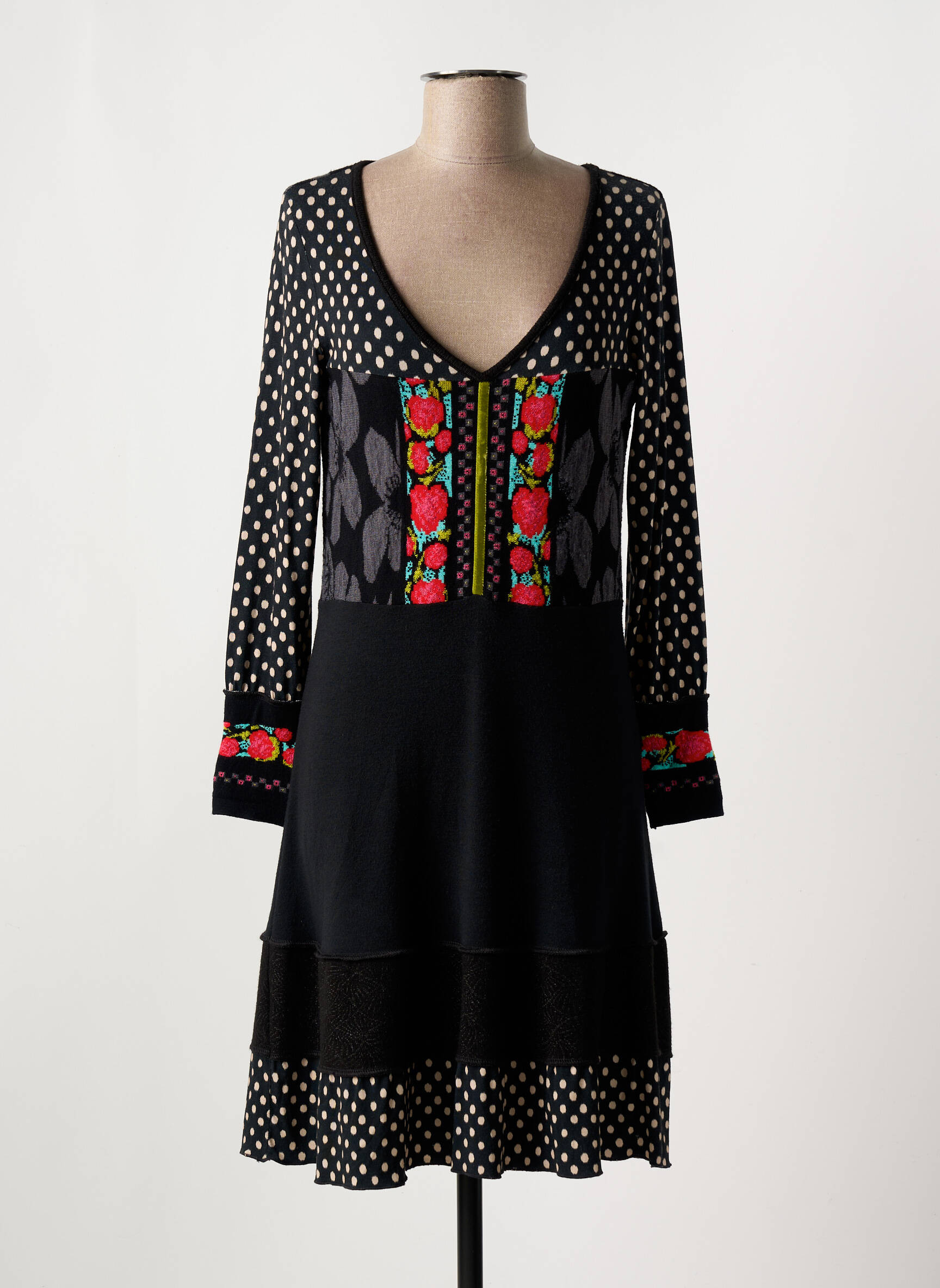 Saisissez une belle occasion mode avec cette robe mi-longue de la marque OLIVIER PHILIPS, idéale pour celles qui recherchent une pièce originale à petit prix. Ce modèle se distingue par un jeu de contrastes audacieux mêlant imprimé à pois, touches florales colorées et détails graphiques qui apporteront une réelle personnalité à votre tenue. Sa coupe légèrement évasée et son col en V flattent la silhouette tout en assurant un confort au quotidien, parfait pour égayer votre dressing sans vous ruiner.
