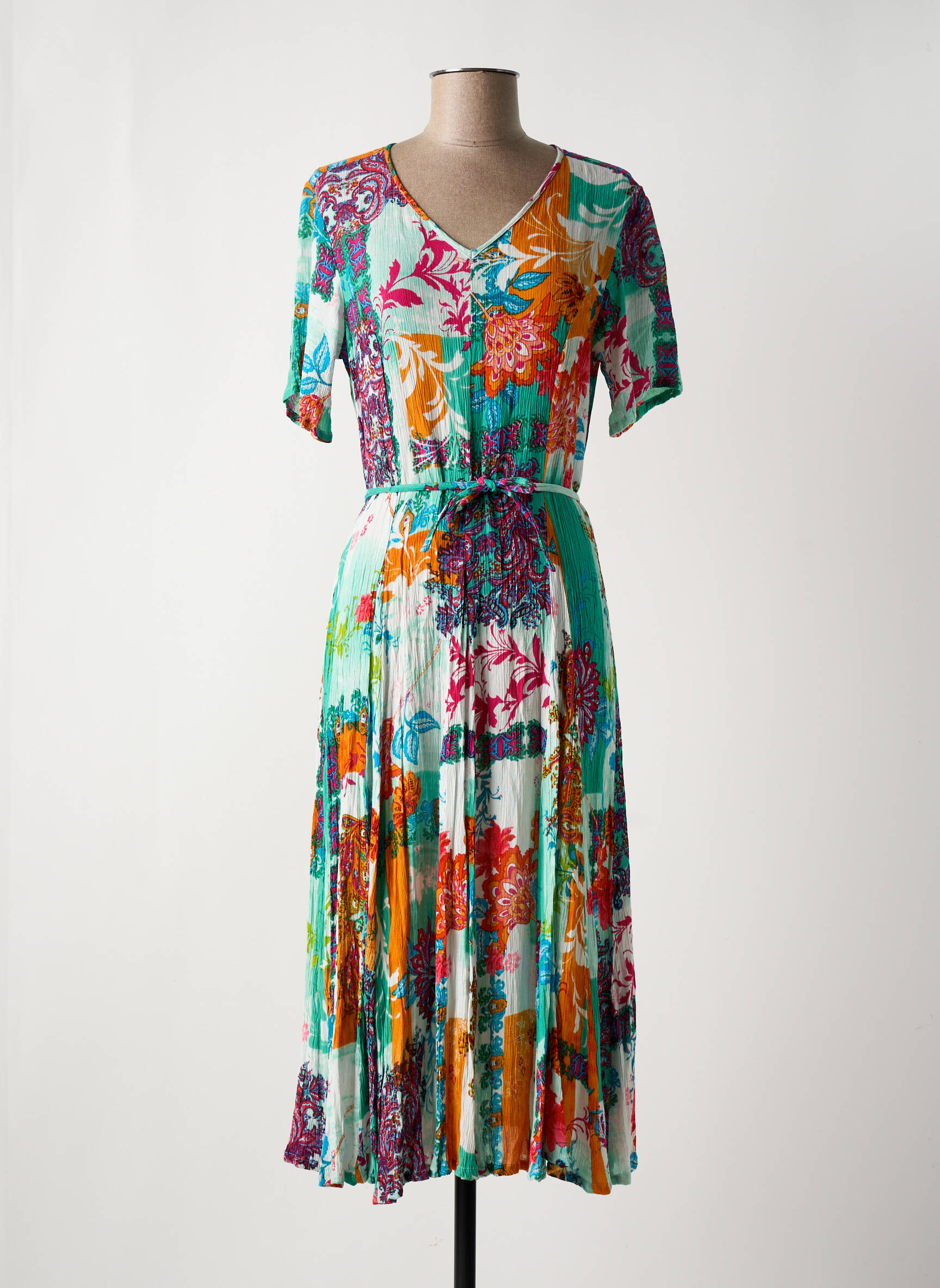 Profitez d’une occasion à ne pas manquer avec cette robe mi-longue ORIENTIQUE NATURALLY pour femme, idéale pour celles qui souhaitent allier style, fraîcheur et petits prix. Avec son imprimé fleuri éclatant aux nuances de turquoise, orange et rouge, elle illumine la silhouette tout en offrant une coupe fluide et confortable. Son encolure en V féminine, ses manches courtes et la ceinture à nouer à la taille apportent une touche élégante et décontractée, parfaite pour les journées ensoleillées ou les sorties estivales. Adoptez ce bon plan pour renouveler votre dressing à prix tout doux !