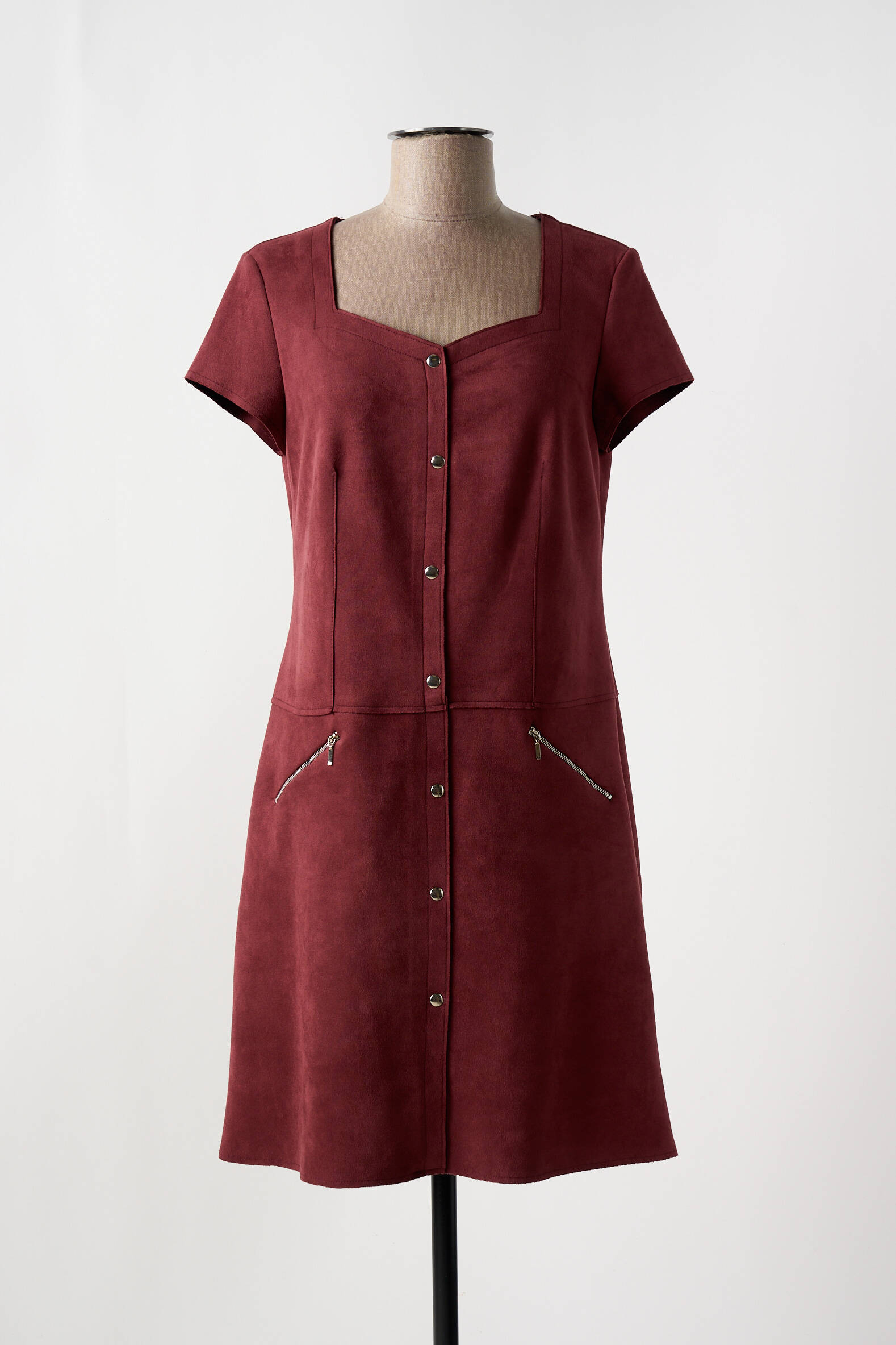 Imaginez une robe qui allie avec élégance modernité et simplicité, celle-ci incarne parfaitement cet équilibre. Cette robe mi-longue de la marque RENATTO BENE pour femme arbore une teinte bordeaux profonde qui invite à la chaleur des soirées d’automne. Son col carré dégage une silhouette sophistiquée tandis que les manches courtes soulignent sa légèreté. Le modèle se ferme par une rangée de boutons sur le devant, ajoutant une touche fonctionnelle et esthétique. Deux poches zippées discrètes viennent parfaire le design, mêlant praticité et style urbain, tandis que la coupe légèrement évasée flatte toutes les morphologies avec subtilité.