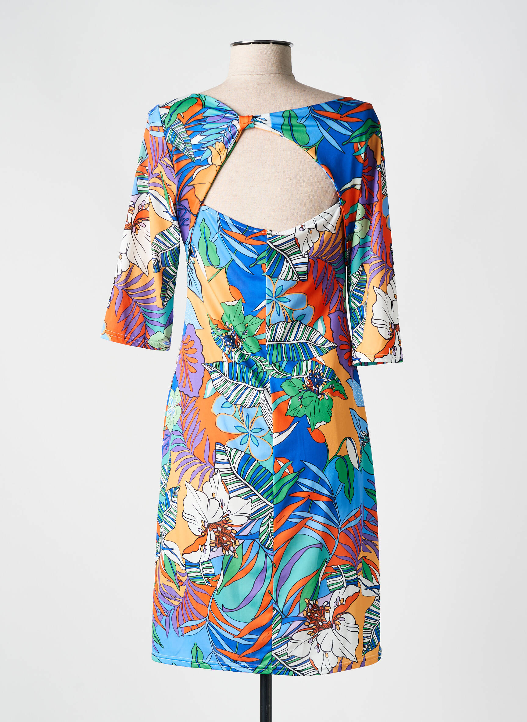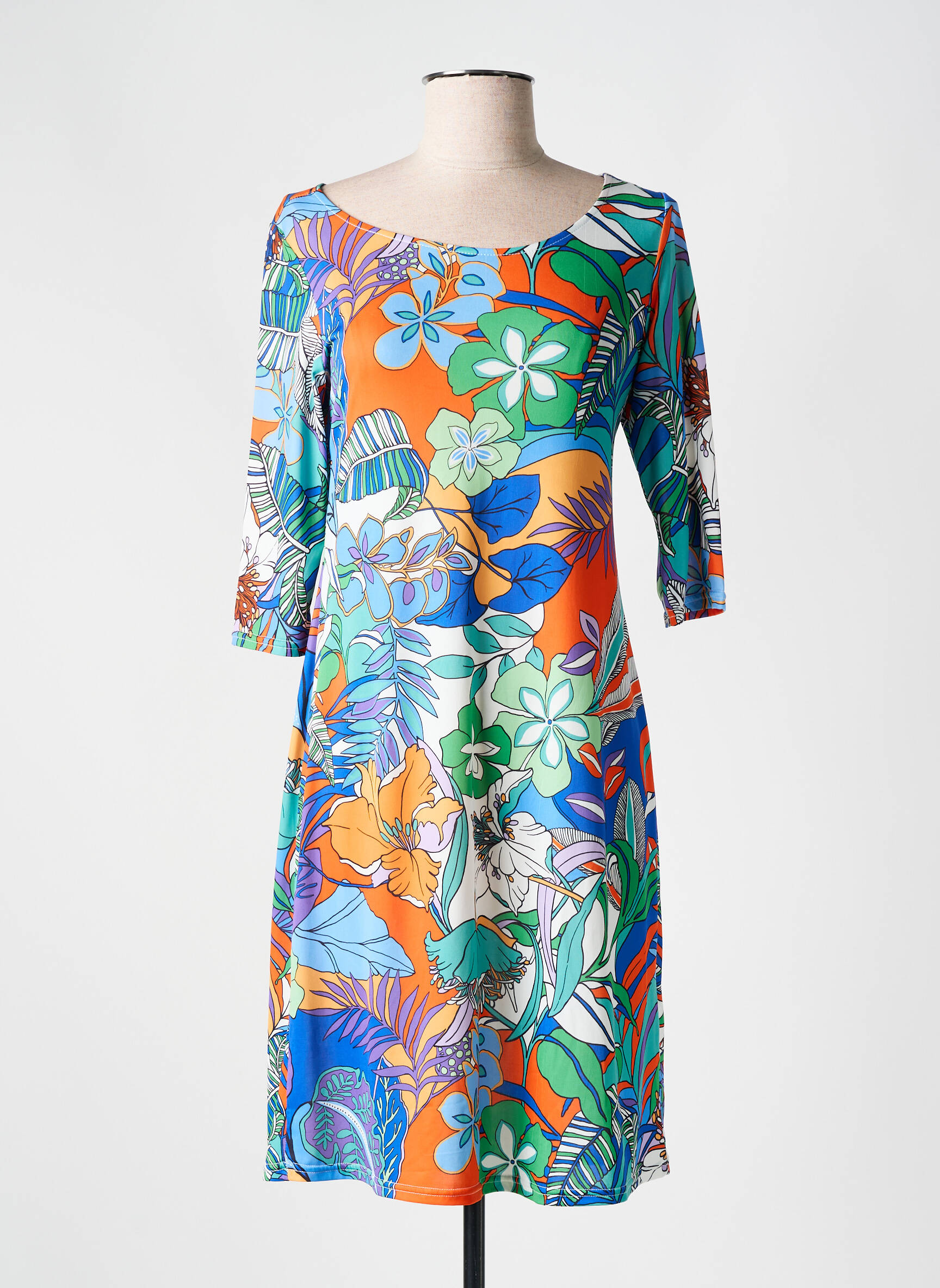 Osez une explosion de couleurs et de fraîcheur avec cette robe mi-longue signée ROMEO POUR JULIETTE qui semble capturer l'énergie d'un jardin tropical en plein été. Son tissu léger épouse délicatement la silhouette tout en offrant une liberté de mouvement grâce à ses manches trois-quarts et sa coupe fluide. Le motif foisonnant de fleurs et de feuilles dans des teintes vives mêle harmonieusement orange, bleu, vert et touches de blanc pour une allure à la fois éclatante et sophistiquée. Parfaite pour illuminer vos journées, cette robe donne un souffle joyeux à votre garde-robe sans effort.