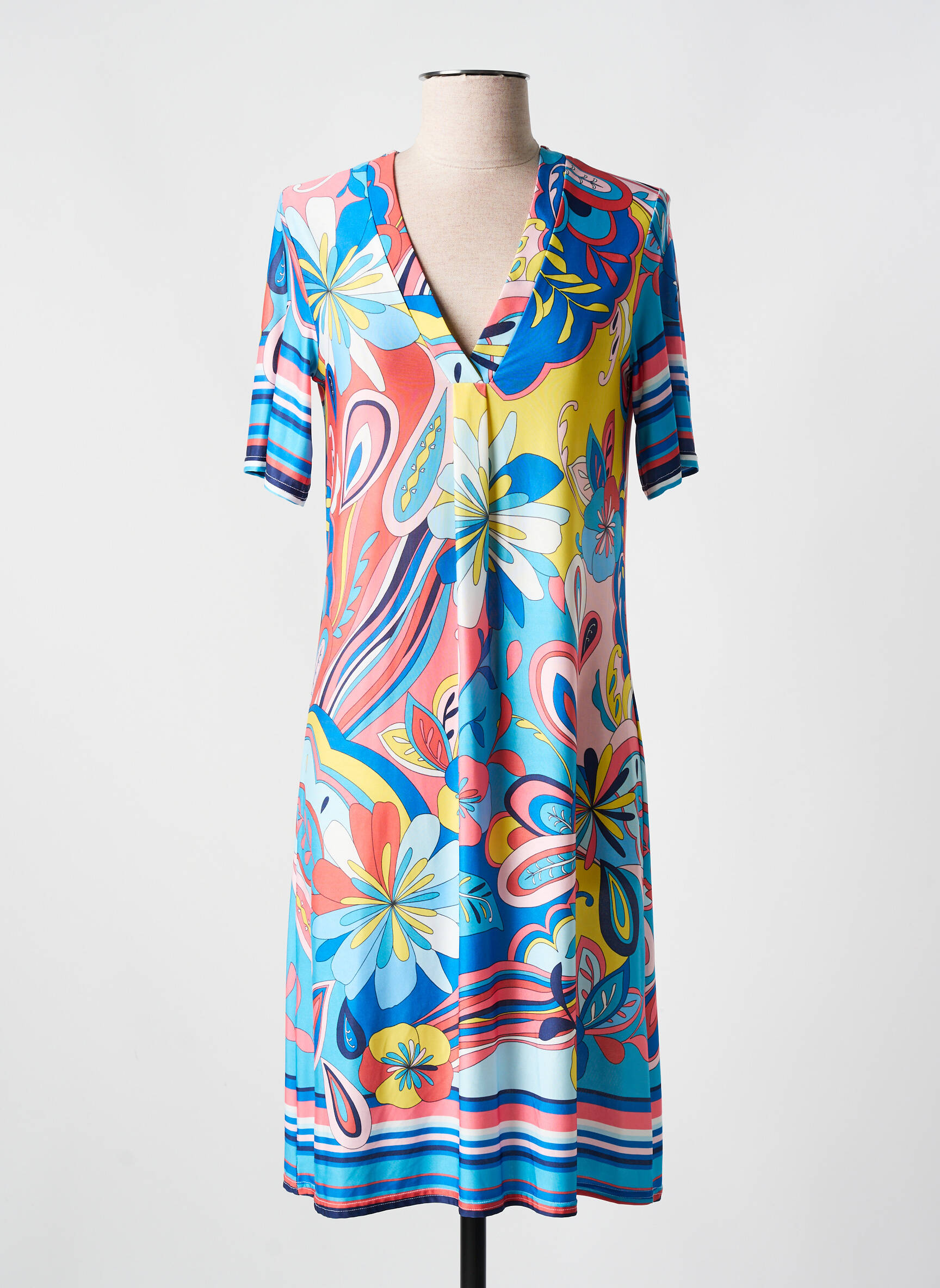 Oser la couleur devient un art avec cette robe mi-longue signée ROMEO POUR JULIETTE qui illumine chaque silhouette d'un cocktail vibrant de teintes éclatantes et florales. Sa coupe fluide et légère s’habille d’un décolleté en V subtil, tandis que ses manches courtes ajoutent une touche de décontraction élégante, le tout sublimé par un imprimé dynamique mêlant fleurs, courbes et rayures dans un jeu de bleu, jaune, rose et touches de blanc qui apporte fraîcheur et originalité à chaque mouvement.