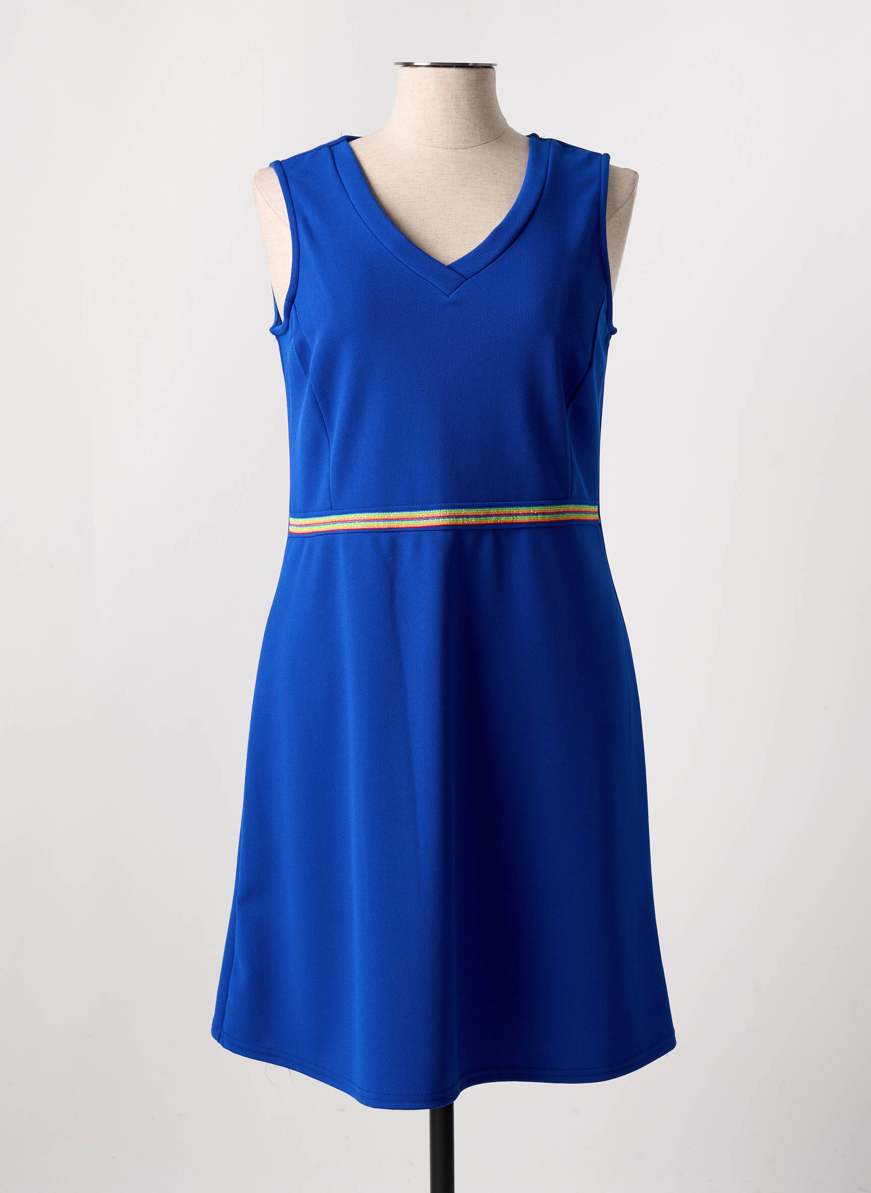 Cette robe bleue peut se porter aussi bien avec des sandales estivales pour une allure décontractée qu’avec des escarpins nude pour une touche plus habillée. Elle se marie parfaitement avec une petite veste claire ou un blazer structuré et peut être rehaussée par quelques accessoires dorés pour souligner délicatement sa ceinture colorée. Un sac à main sobre ou une pochette colorée viendront compléter l’ensemble, pour une silhouette moderne et féminine en toutes circonstances.