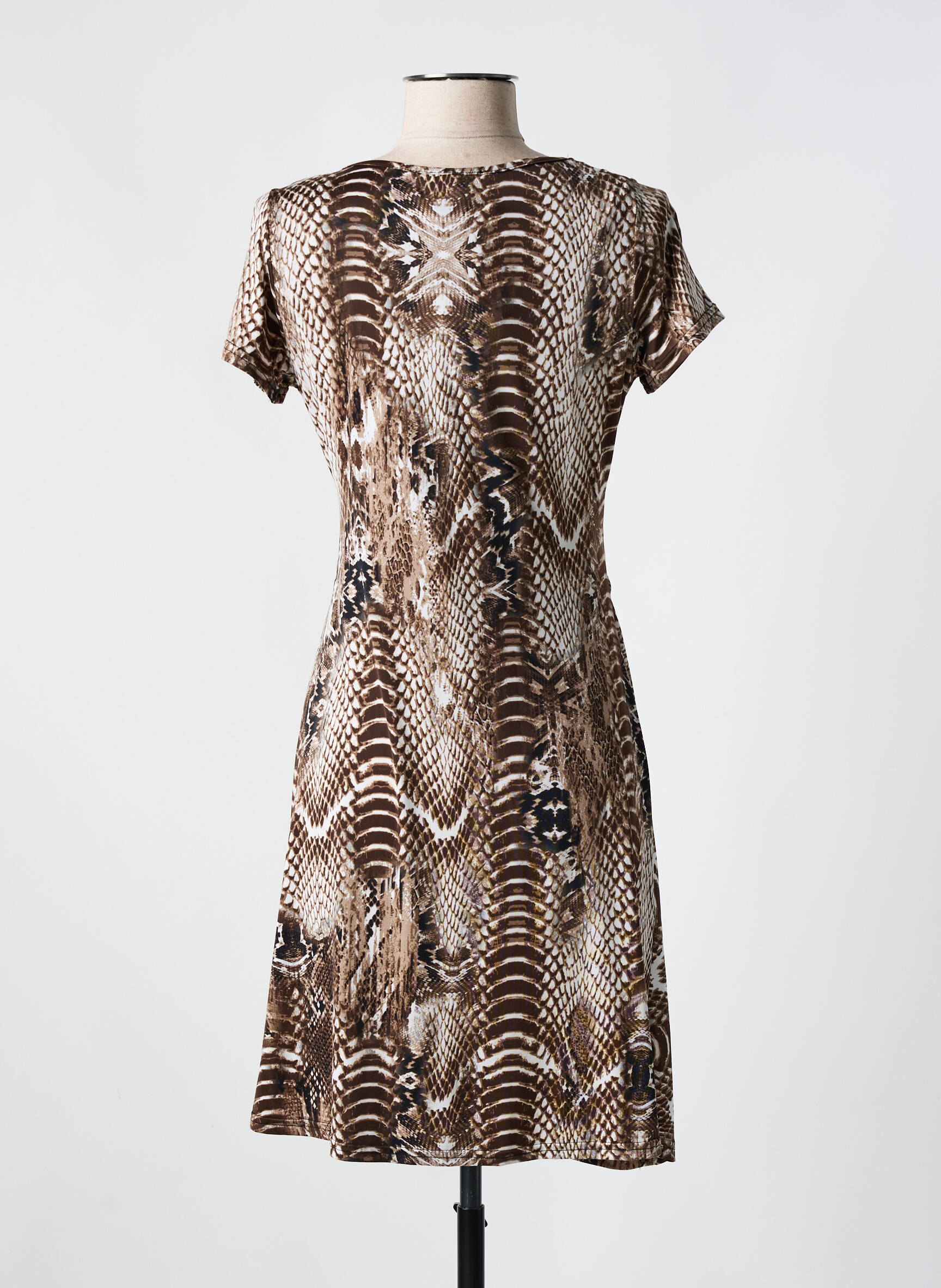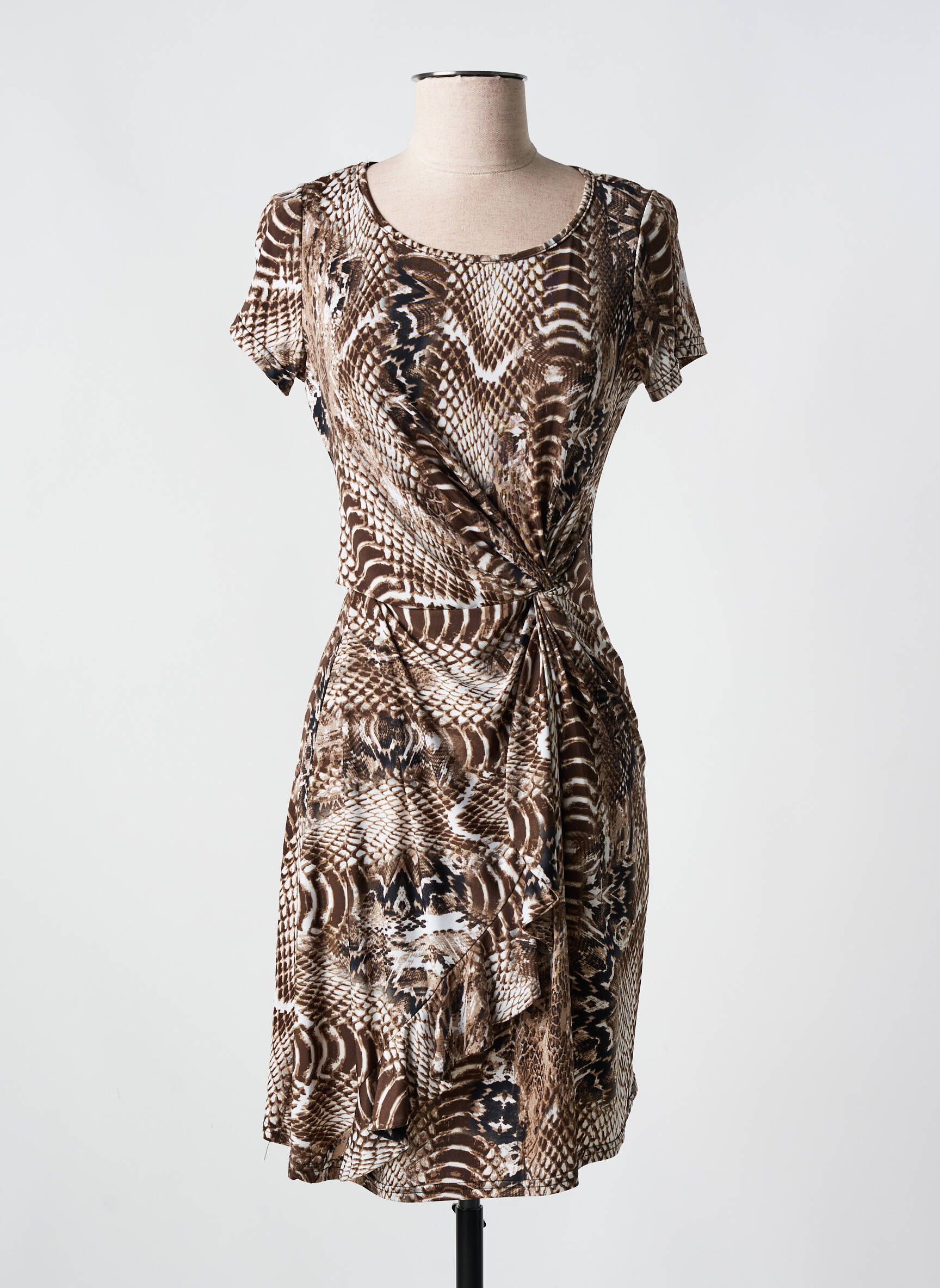 Quand l’élégance rencontre un souffle sauvage, cette robe mi-longue de ROMEO POUR JULIETTE s’impose par son imprimé animalier sophistiqué aux nuances de brun et noir qui danse subtilement à travers un jeu de motifs hypnotiques, tandis que sa coupe cintrée épouse délicatement la silhouette féminine, sublimée par un drapé asymétrique à la taille qui ajoute une touche d’originalité et de fluidité à l’ensemble.