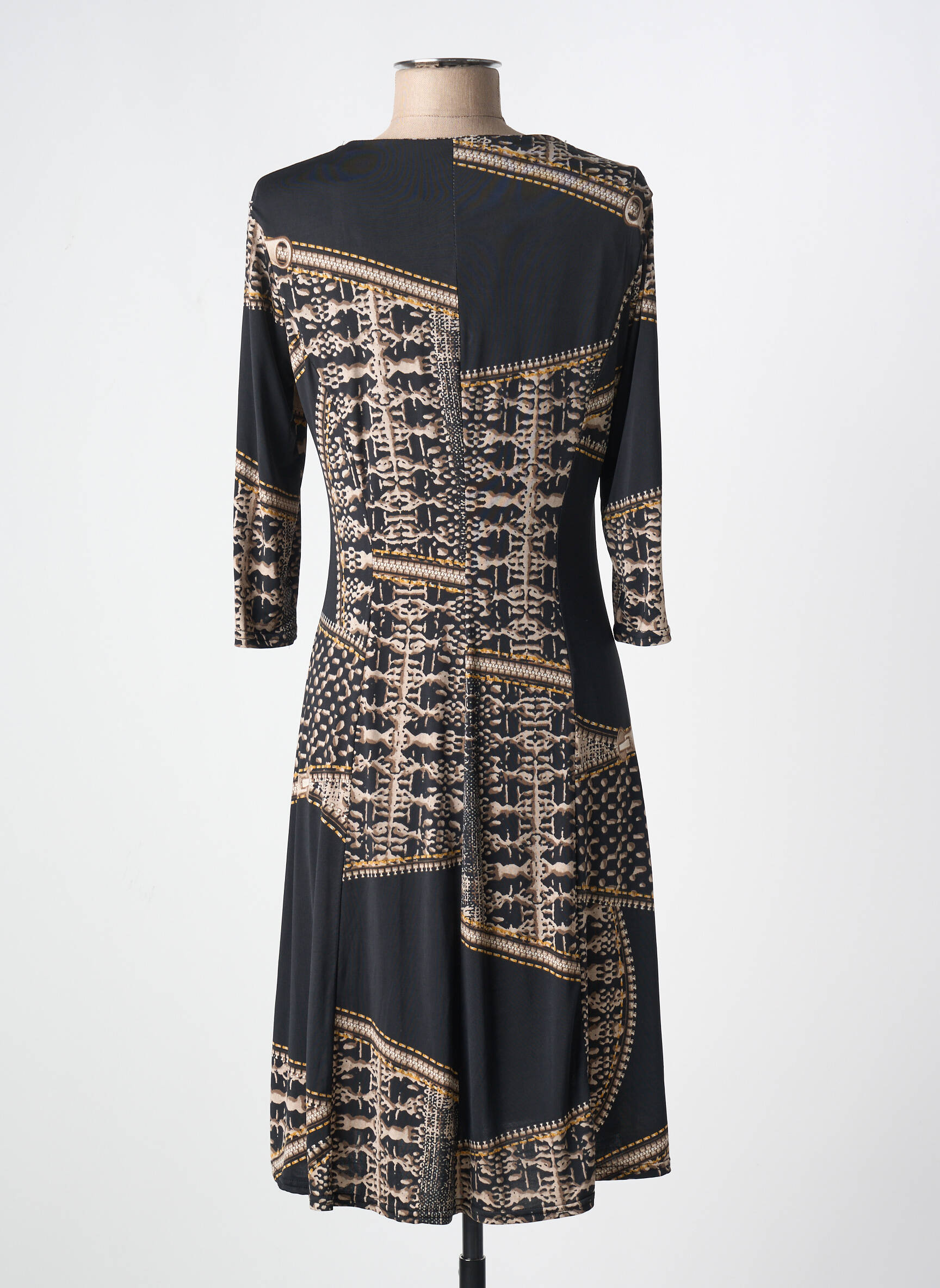 Profitez d’une occasion à ne pas manquer avec cette robe mi-longue ROMEO POUR JULIETTE à prix mini, parfaite pour sublimer votre garde-robe sans vous ruiner. Son motif graphique mêle avec élégance des touches de noir, de beige et de doré pour un effet patchwork sophistiqué, tandis que sa coupe fluide et ses manches trois-quarts offrent un confort idéal au quotidien comme pour une sortie. Voilà un véritable bon plan pour adopter une allure moderne et chic à petit prix.
