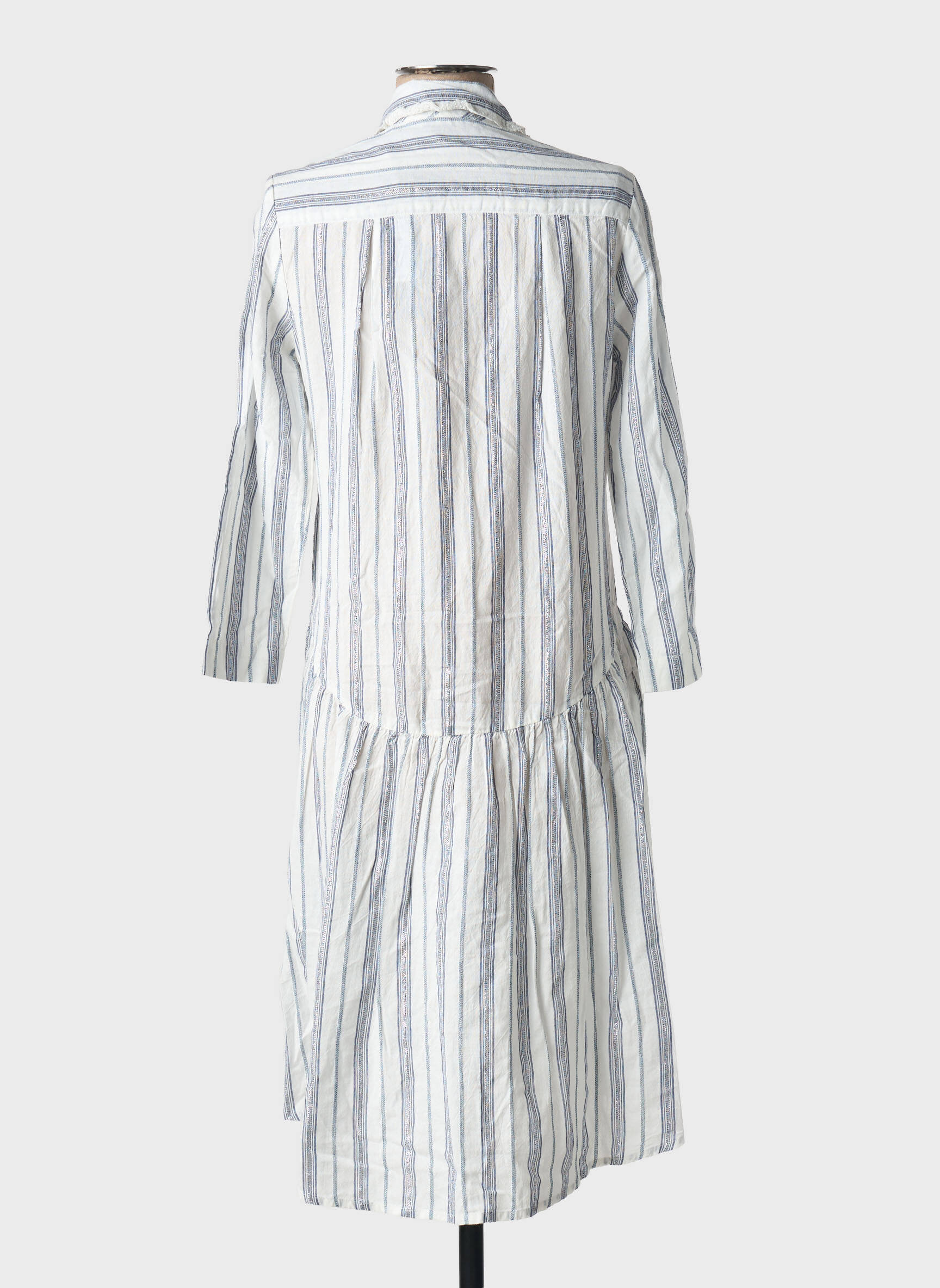 Pour une allure décontractée, cette robe se porte facilement avec une paire de baskets blanches et une veste en jean. En version plus habillée, il suffit d’ajouter des sandales à talons et un petit sac à main. On peut aussi jouer avec les accessoires en optant pour une ceinture fine à la taille pour souligner la silhouette ou un chapeau pour une note estivale. Les bijoux dorés ou argentés s’accordent parfaitement à ses rayures claires pour une finition élégante et actuelle.