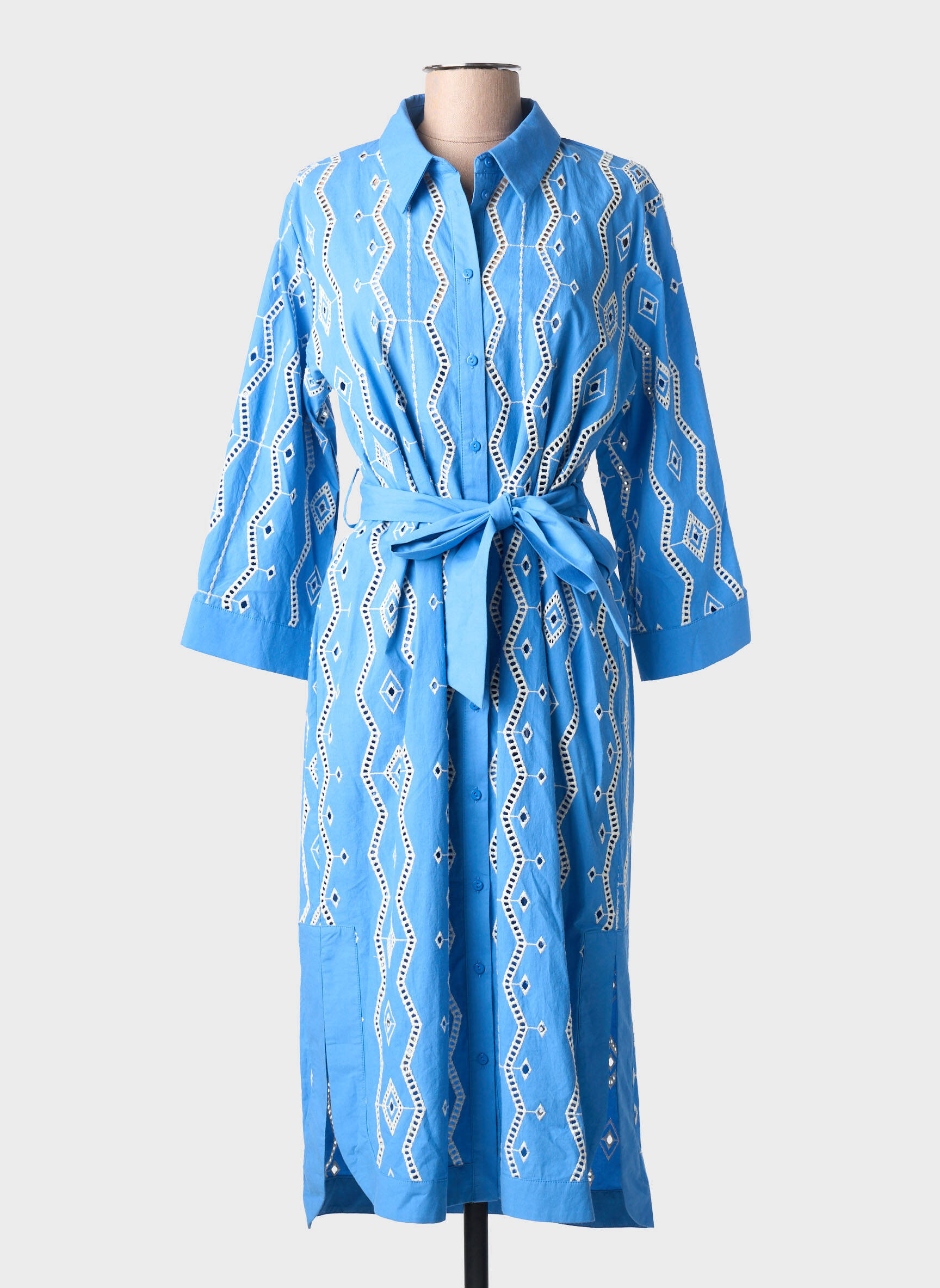 Craquez pour cette robe mi-longue SUNCOO à prix tout doux, idéale pour apporter une touche de fraîcheur à votre garde-robe sans vous ruiner. Sa coupe fluide, ses manches trois-quarts et sa ceinture nouée à la taille mettent en valeur la silhouette, tandis que le motif géométrique délicat sur fond bleu illumine le look avec originalité et féminité. Un vrai bon plan mode pour un style élégant et tendance à petit prix.