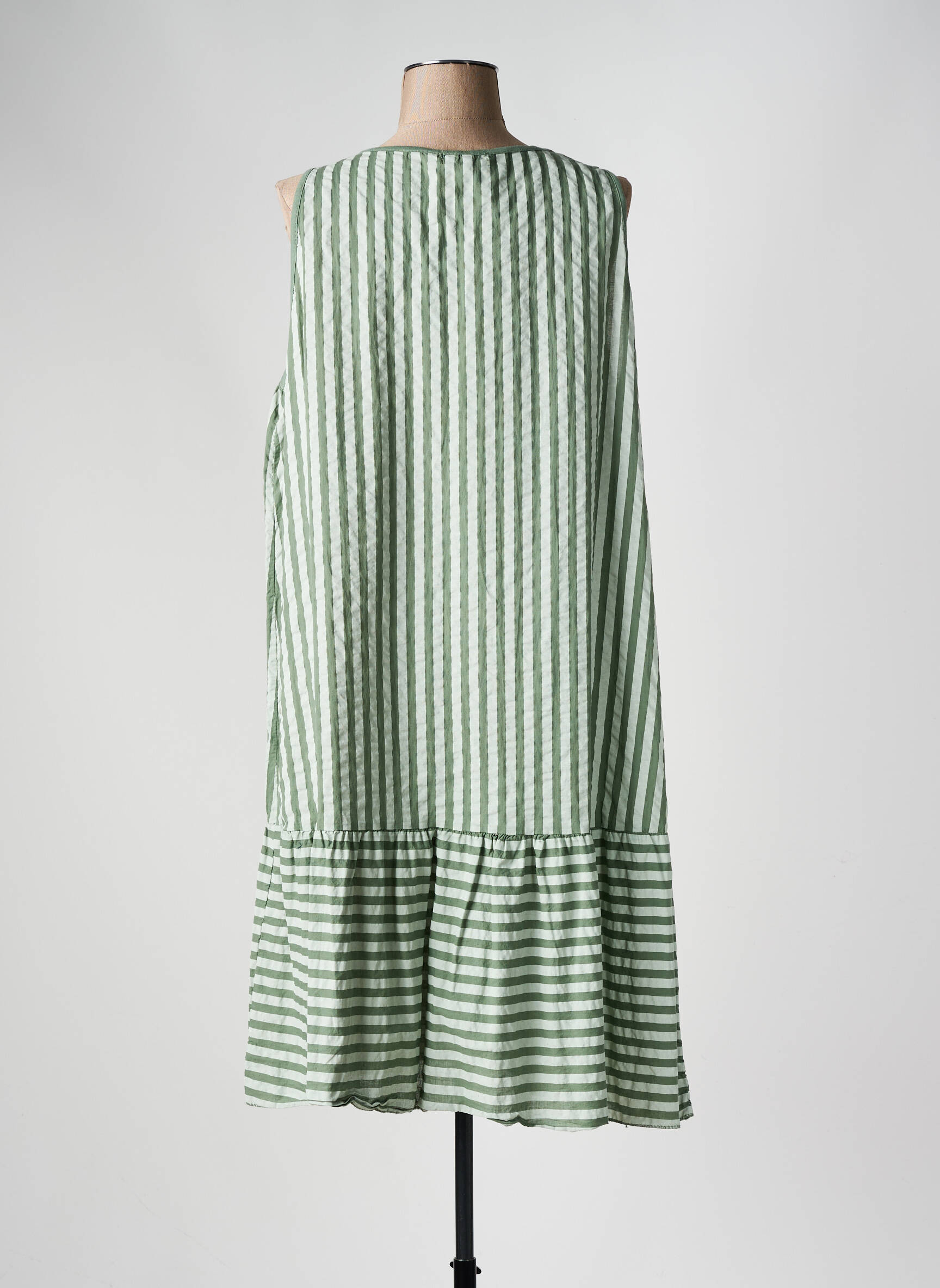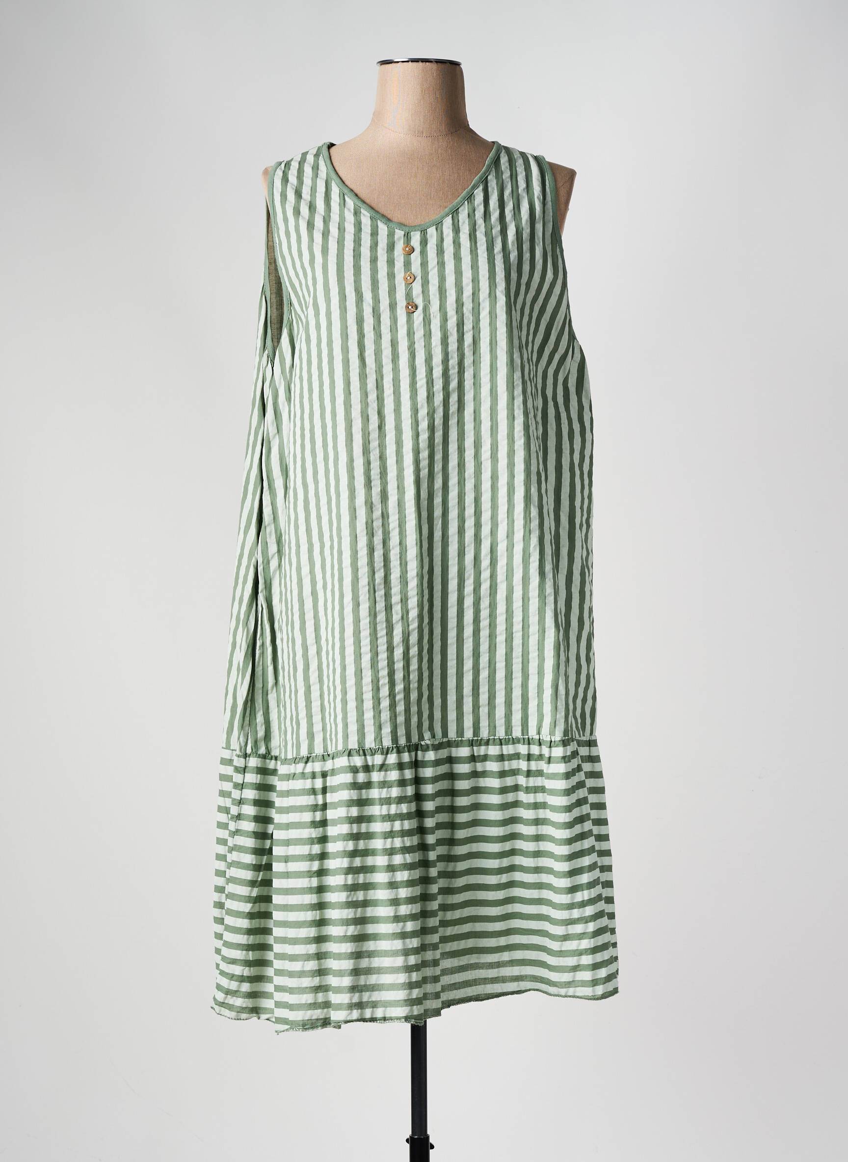 Profitez d’une belle opportunité avec cette robe mi-longue TERA BORA à petit prix, idéale pour apporter une touche de fraîcheur à votre dressing sans vous ruiner. Son motif à rayures vertes et blanches lui confère un esprit estival facile à porter au quotidien, tandis que sa coupe fluide sans manches et sa découpe volantée à la base offrent confort et liberté de mouvement. Les petits boutons au niveau de l’encolure ajoutent une note de charme à ce modèle parfait pour savourer les beaux jours en toute simplicité.