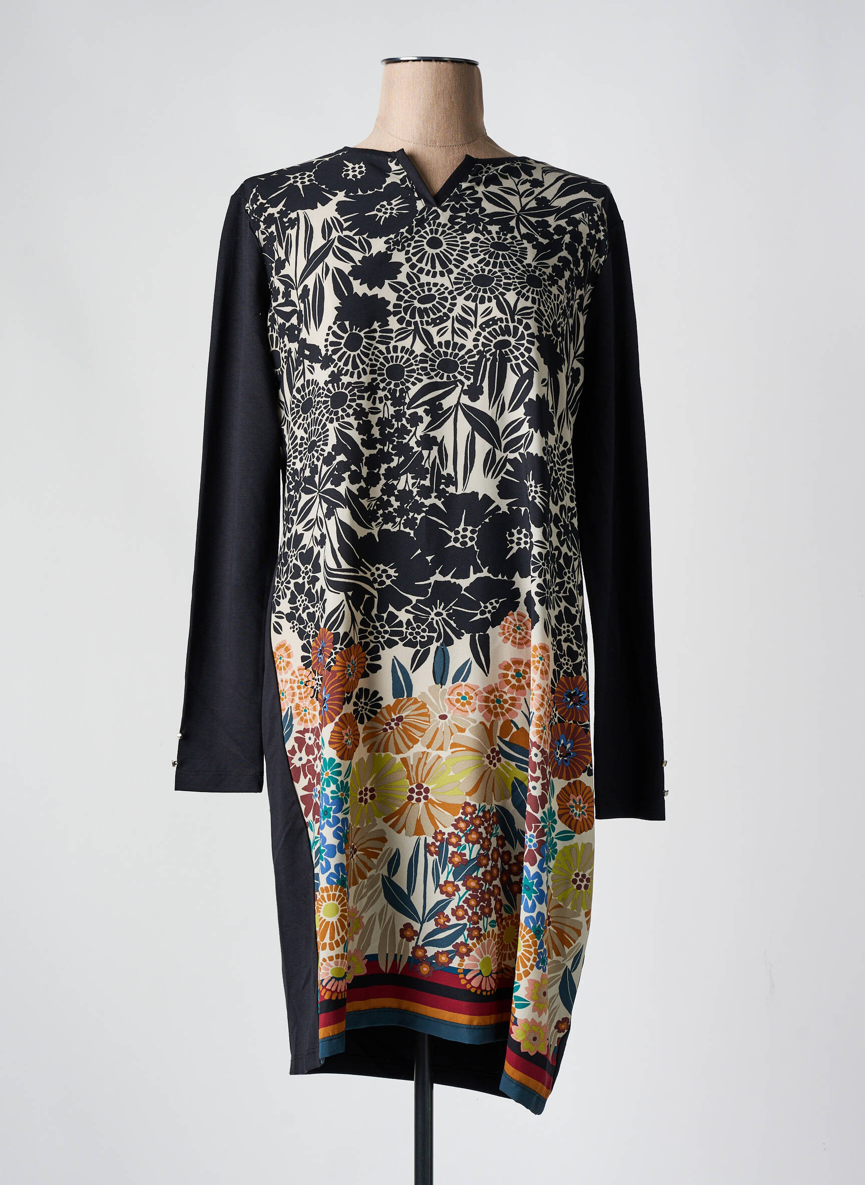 Profitez d’une superbe affaire avec cette robe mi-longue THALASSA pour femme, un choix futé pour celles qui recherchent style et petits prix. Son motif floral graphique en noir et blanc sur la partie supérieure contraste harmonieusement avec les touches colorées et les imprimés fleuris en bas de la robe, tandis que les manches longues noires apportent une touche d’élégance et de sobriété. Cette pièce originale et pleine de caractère vous permet d’afficher une allure moderne sans vous ruiner, idéale pour dynamiser votre dressing à moindre coût.