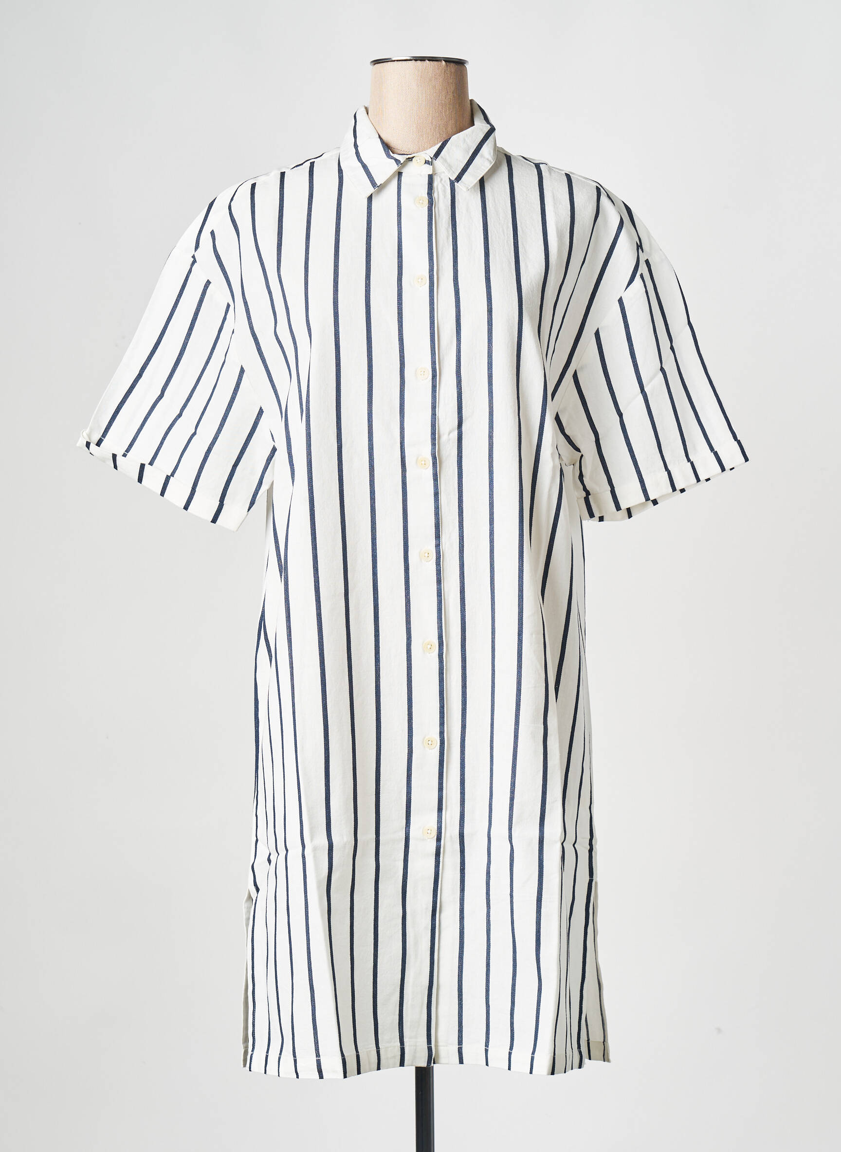 Craquez pour cette robe mi-longue THINKING MU pour femme, une véritable aubaine pour celles qui recherchent à la fois style et économies. Avec sa coupe droite et décontractée, elle séduit par ses rayures verticales bleu marine sur fond écru, son col chemise classique et ses manches courtes à revers, le tout rehaussé d'une patte de boutonnage sur le devant pour une allure casual et tendance, parfait pour profiter d'une pièce de marque à prix réduit.
