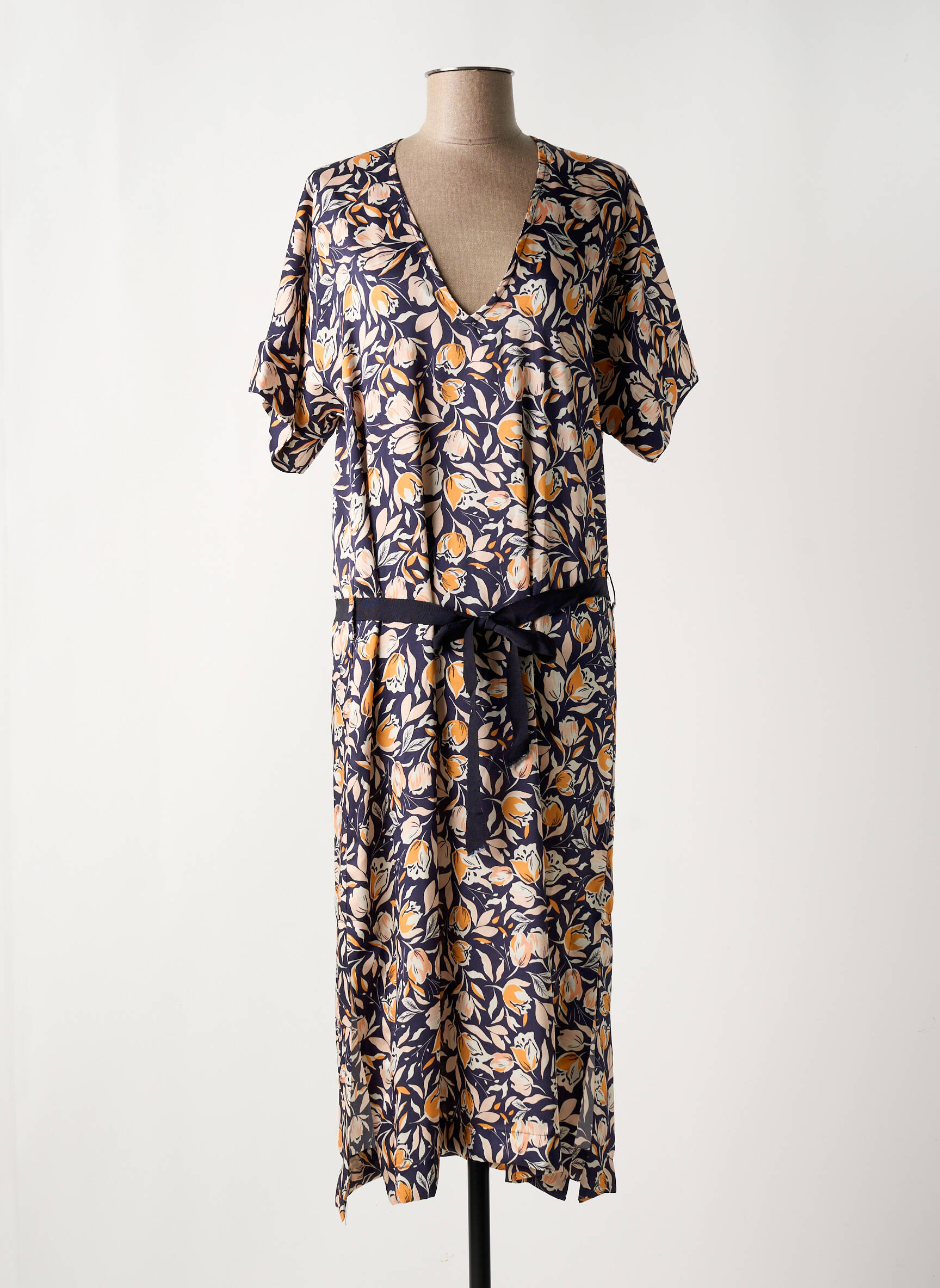 Profitez d'une occasion unique de vous offrir cette robe mi-longue TOUPY à prix tout doux, idéale pour celles qui recherchent une pièce chic sans se ruiner. Sa coupe fluide met en valeur toutes les silhouettes, tandis que son imprimé floral dynamique aux teintes bleu marine, jaunes et blanches apporte une touche de fraîcheur à votre garde-robe. Avec son joli décolleté en V et sa ceinture à nouer qui souligne délicatement la taille, c'est la robe parfaite pour un look élégant et confortable au quotidien.