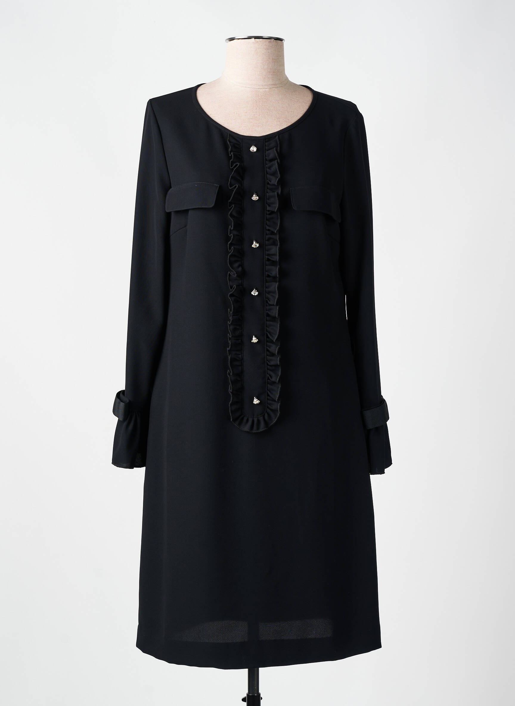Craquez pour cette robe mi-longue de la marque WEILL, une pièce élégante et sophistiquée à prix malin qui saura sublimer votre garde-robe sans vous ruiner. Avec sa coupe droite flatteuse, ses manches longues agrémentées de petits revers boutonnés et son délicat plastron volanté ponctué de boutons, cette robe noire allie raffinement et modernité pour toutes vos occasions. C’est la bonne affaire à ne pas manquer pour allier chic intemporel et petits prix.