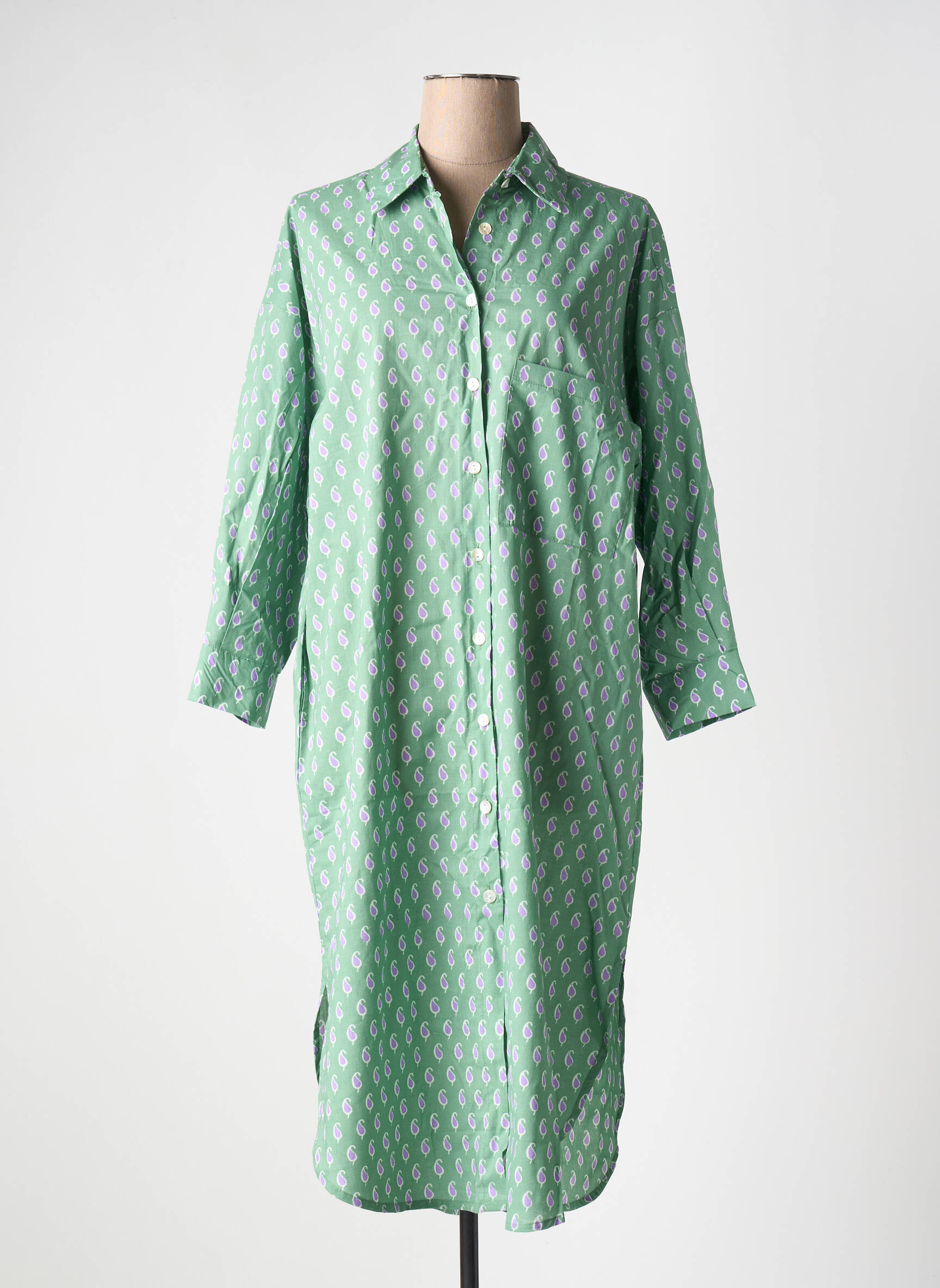 Profitez d’un bon plan avec cette robe mi-longue signée ZEN ETHIC, une pièce idéale pour apporter de la fraîcheur à votre garde-robe sans vous ruiner. Son imprimé délicat sur fond vert tendre et sa coupe légèrement ample en font un modèle à la fois élégant et décontracté, facile à porter au quotidien. Les détails comme la poche poitrine, la patte de boutonnage et les fentes sur les côtés ajoutent une touche de modernité tout en assurant un confort maximal, parfait pour se faire plaisir à petit prix.