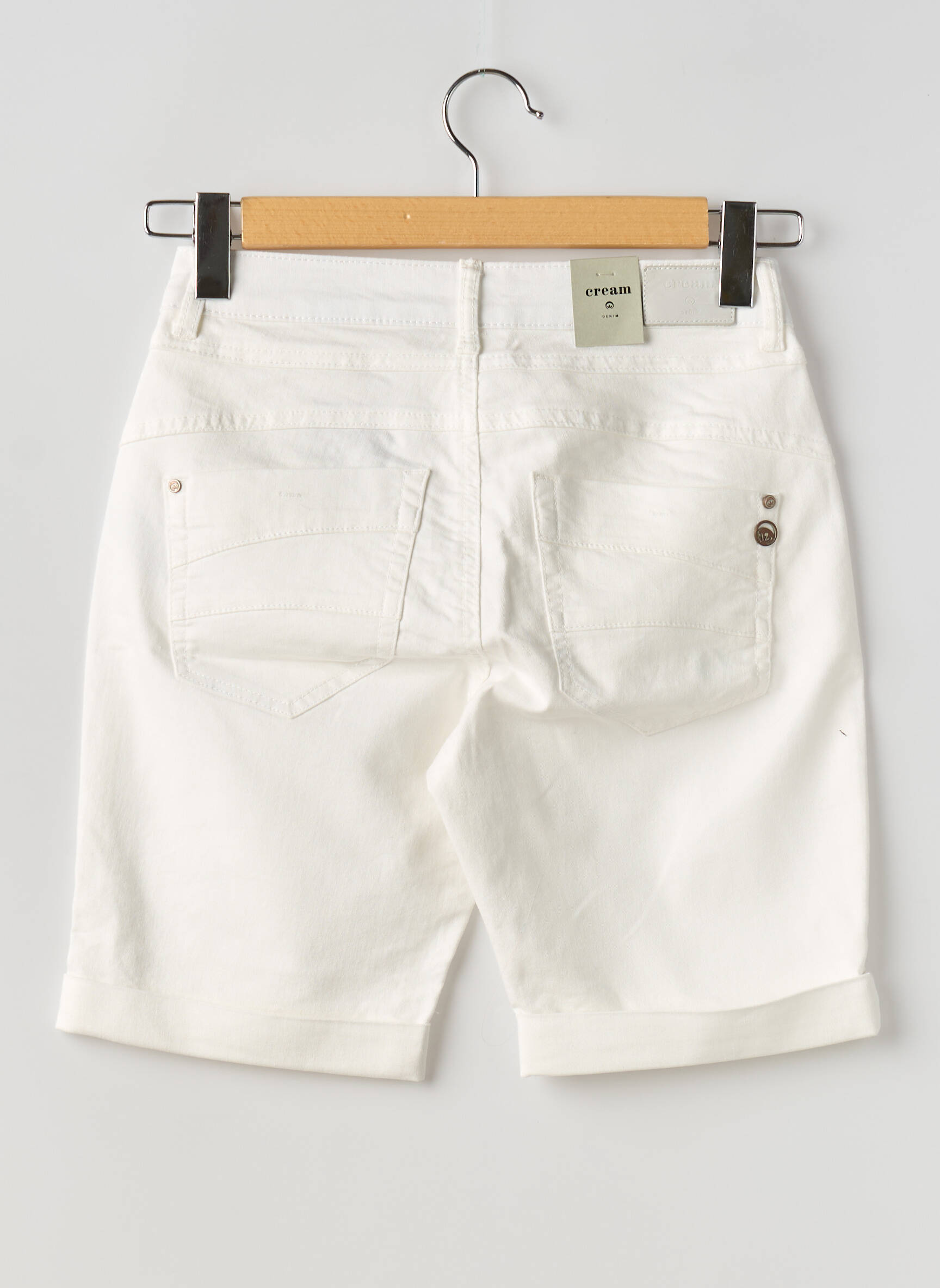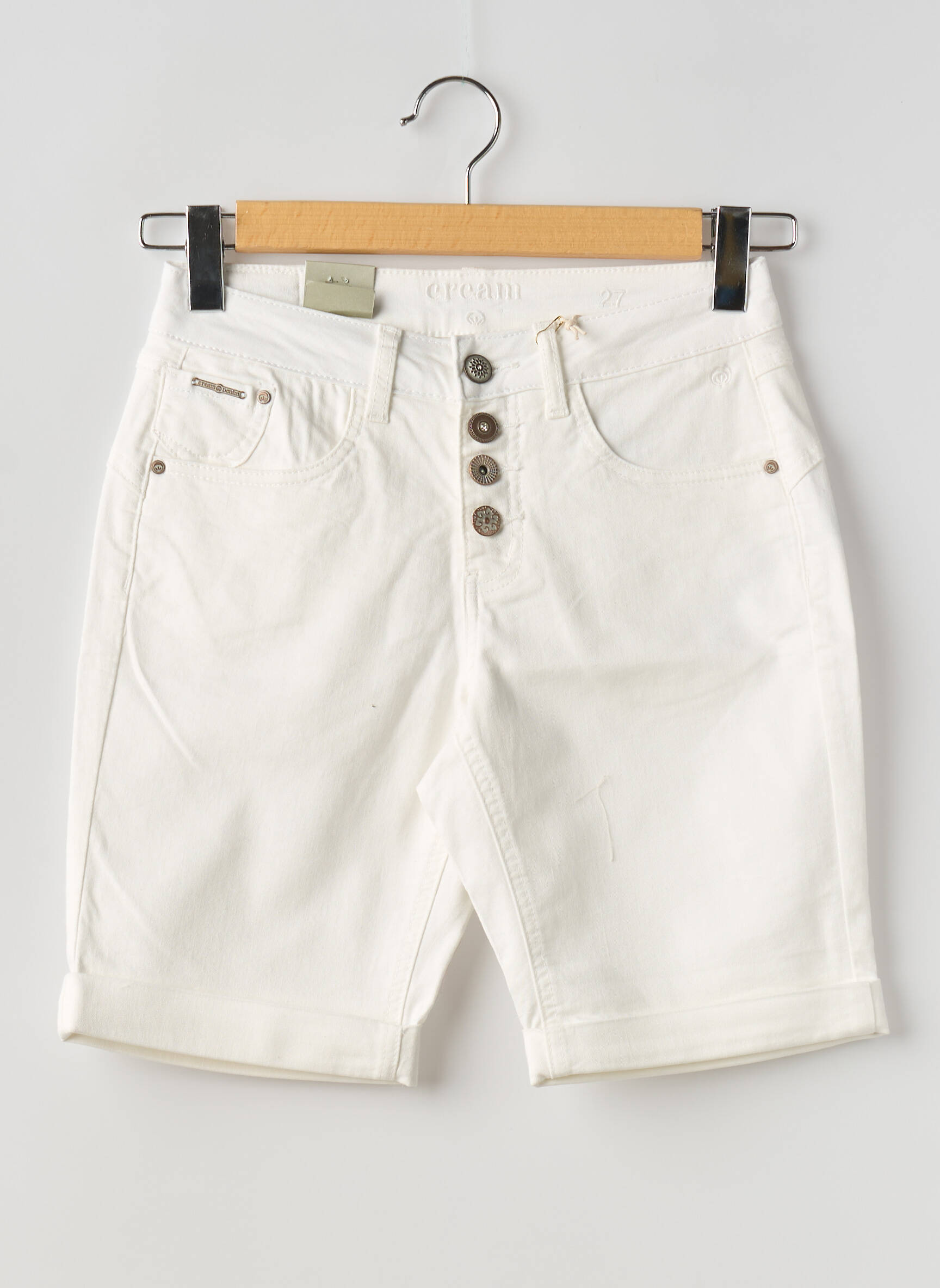 Voici une opportunité à ne pas manquer pour vous offrir ce bermuda CREAM pour femme à petit prix. Sa coupe confortable et tendance, associée à sa couleur blanche lumineuse, en fait un indispensable pour les journées ensoleillées. Doté de jolis boutons métalliques sur le devant et de finitions soignées, ce bermuda allie style et simplicité, parfait pour des looks décontractés ou plus habillés, tout en vous faisant profiter d'une belle économie.