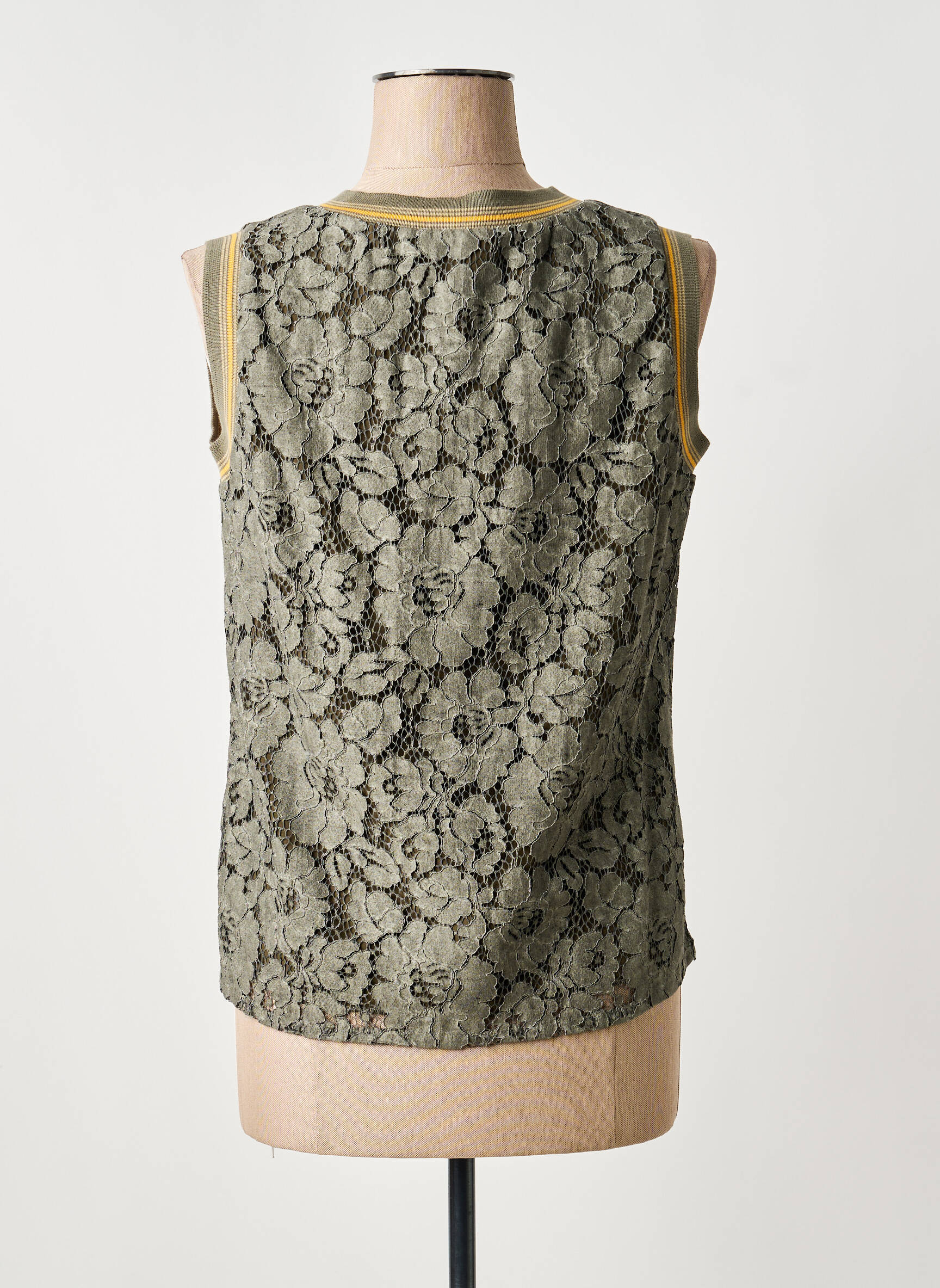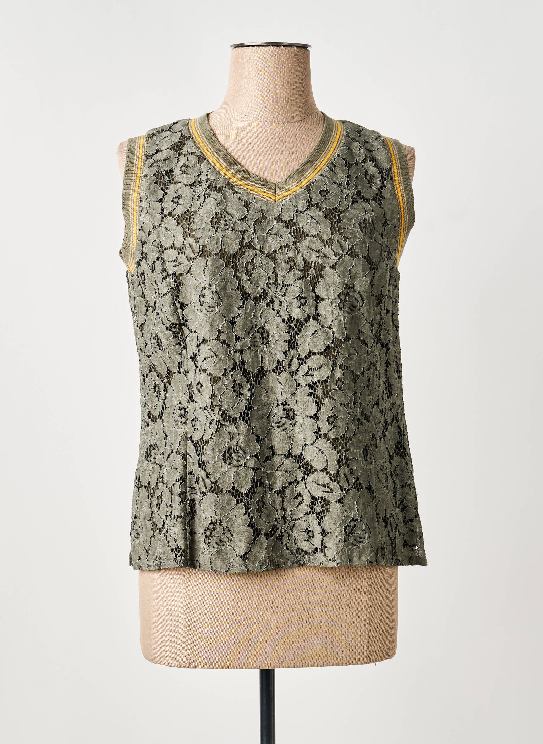 Profitez d’un véritable bon plan avec ce débardeur MERI & ESCA pour femme, une pièce originale à prix mini qui apporte une touche de raffinement à votre garde-robe avec sa dentelle florale délicate et son col en V souligné par des finitions contrastées, parfait pour allier élégance et petits prix.