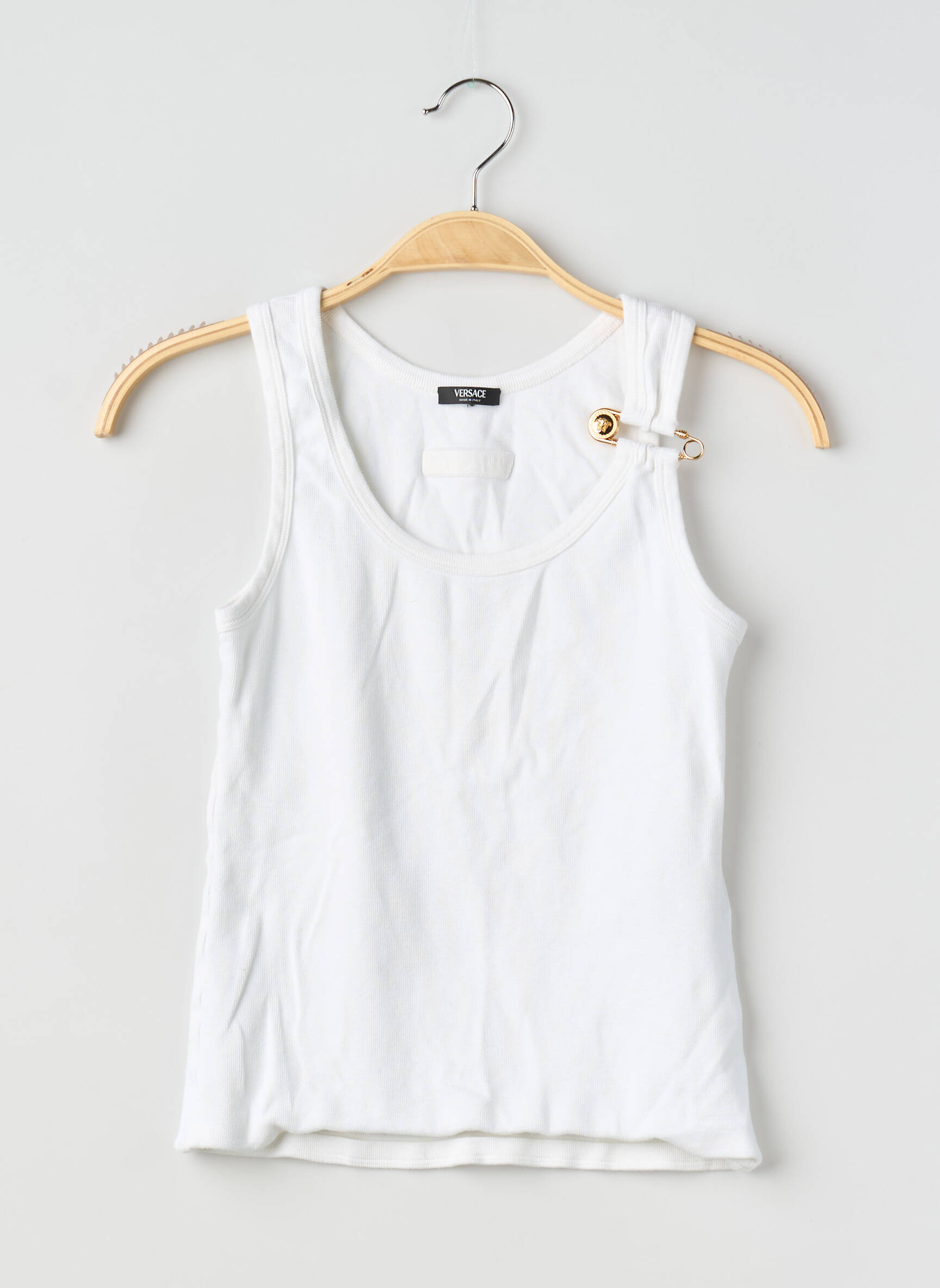 Profitez d’un bon plan exceptionnel avec ce débardeur pour femme signé Versace, offrant l’élégance intemporelle de la maison à prix doux. Ce modèle blanc séduit par sa coupe épurée et son col rond, tandis qu’un détail doré, façon broche signature sur l’épaule, ajoute une touche sophistiquée et reconnaissable à votre look du quotidien. C’est l’occasion parfaite d’accéder à une pièce iconique sans compromis sur votre budget.