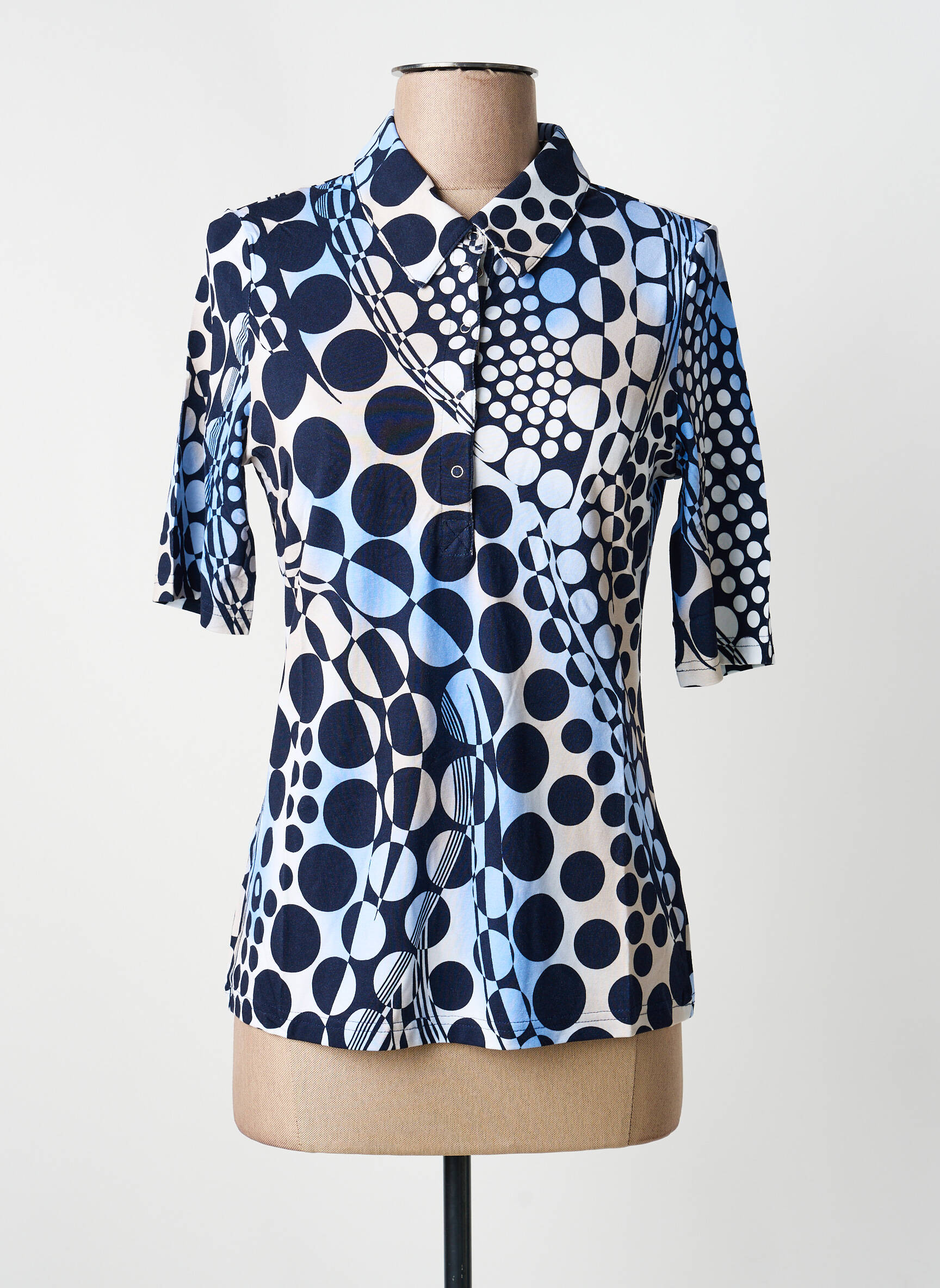 Profitez d’une offre exceptionnelle avec ce polo Barbara Lebek pour femme, parfait pour celles qui cherchent un style original à petit prix. Son imprimé graphique allie différentes tailles de pois dans des tons de bleu et de blanc pour une allure dynamique et moderne, tandis que la coupe féminine légèrement cintrée met la silhouette en valeur. Ce modèle propose des manches mi-longues et une patte de boutonnage classique, idéale pour associer confort et élégance au quotidien sans se ruiner.