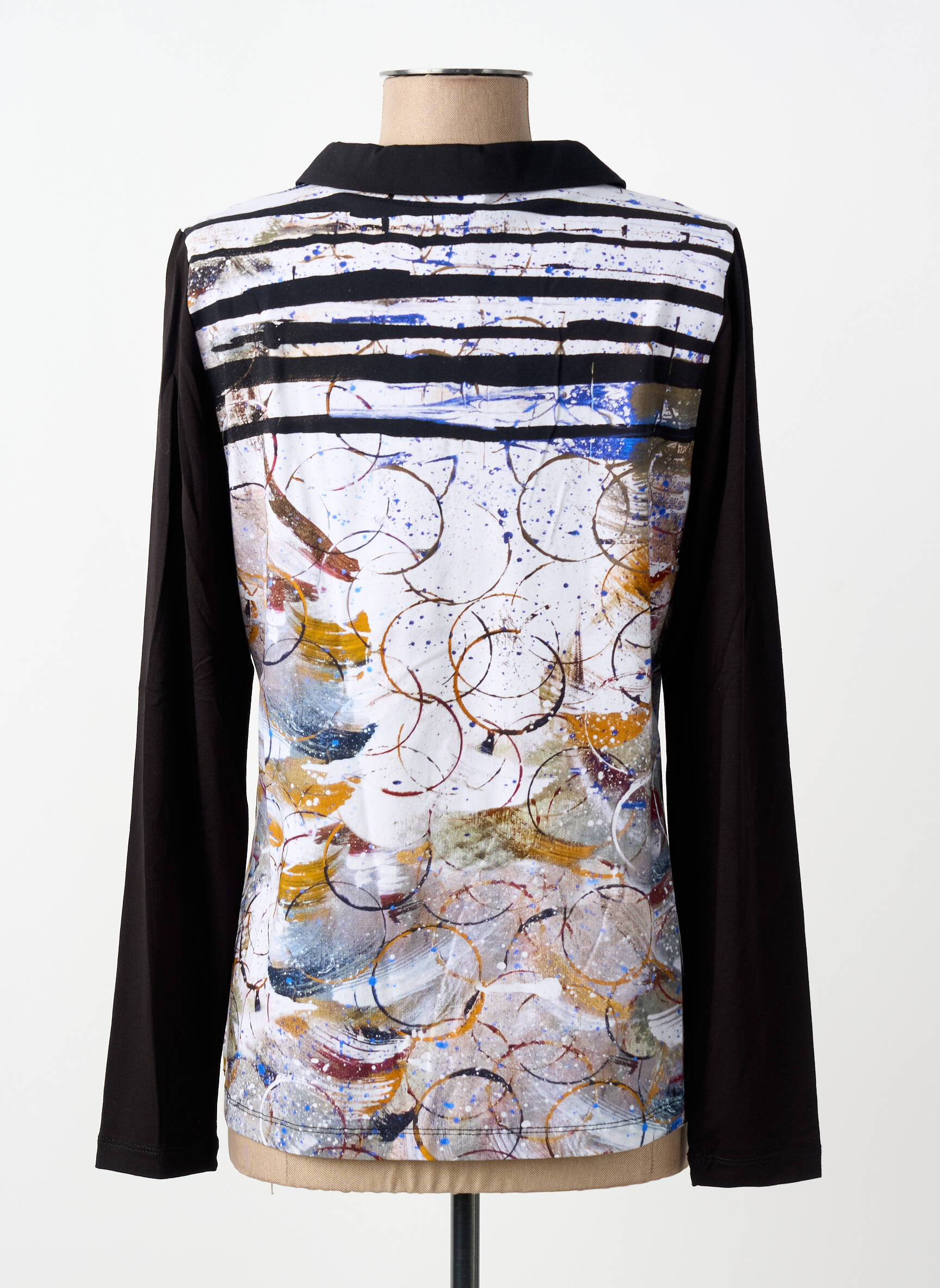 Craquez pour ce polo femme signé Dolcezza, une véritable affaire à saisir pour apporter une touche artistique à votre garde-robe sans vous ruiner. Ce modèle arbore un col en V élégant avec un revers noir qui contraste joliment avec le devant coloré, orné de motifs abstraits et de touches métalliques pour un effet dynamique et moderne, tandis que les manches longues unies assurent une silhouette harmonieuse et facile à porter au quotidien. C’est le compromis parfait pour celles qui cherchent à la fois style et petit prix.