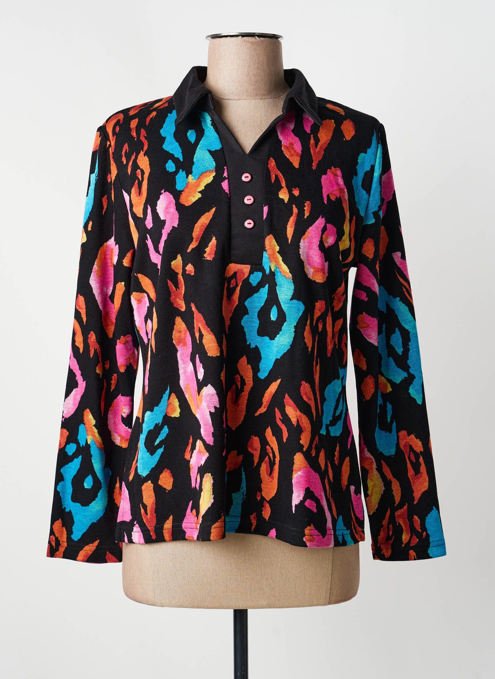 Profitez d’un bon plan avec ce polo pour femme signé GUY DUBOUIS, parfait pour apporter une touche d’originalité à petit prix à votre garde-robe. Ce modèle séduit par son imprimé animalier multicolore dynamique sur fond noir, réhaussé par un col classique et une patte de boutonnage discrète. Idéal pour celles qui veulent se démarquer sans se ruiner, il combine confort, style et élégance à un prix tout doux.