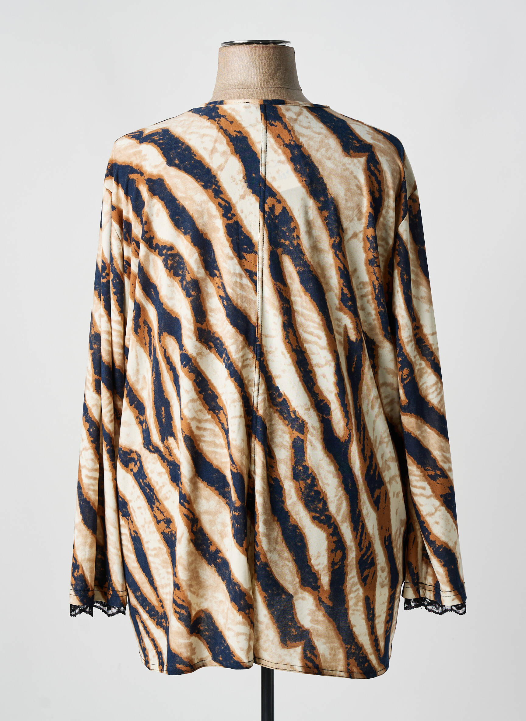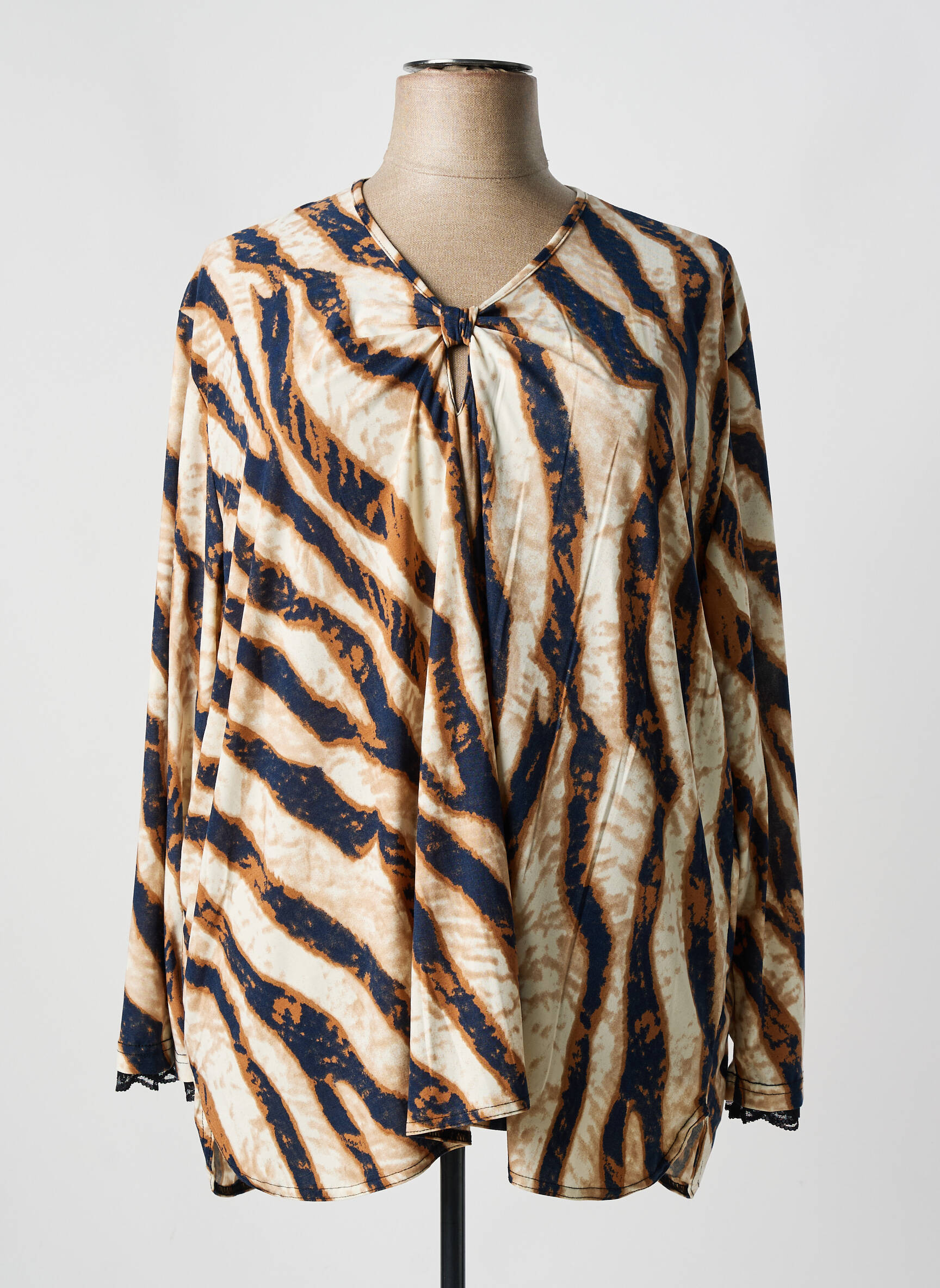 Et si votre T-shirt devenait une véritable œuvre d’art à porter ? Ce modèle signé 2W PARIS associe un motif abstrait rappelant les ondulations d’une nature sauvage aux teintes chaleureuses de beige, marron et bleu marine, créant un effet visuel à la fois moderne et élégant. Sa coupe fluide et légèrement évasée, avec des manches longues, offre un confort décontracté tout en mettant en valeur la silhouette avec douceur. Le jeu subtil de plis au centre ajoute une touche de sophistication et dynamise l’ensemble, faisant de ce T-shirt une pièce à la fois originale et facile à intégrer à toutes vos tenues.