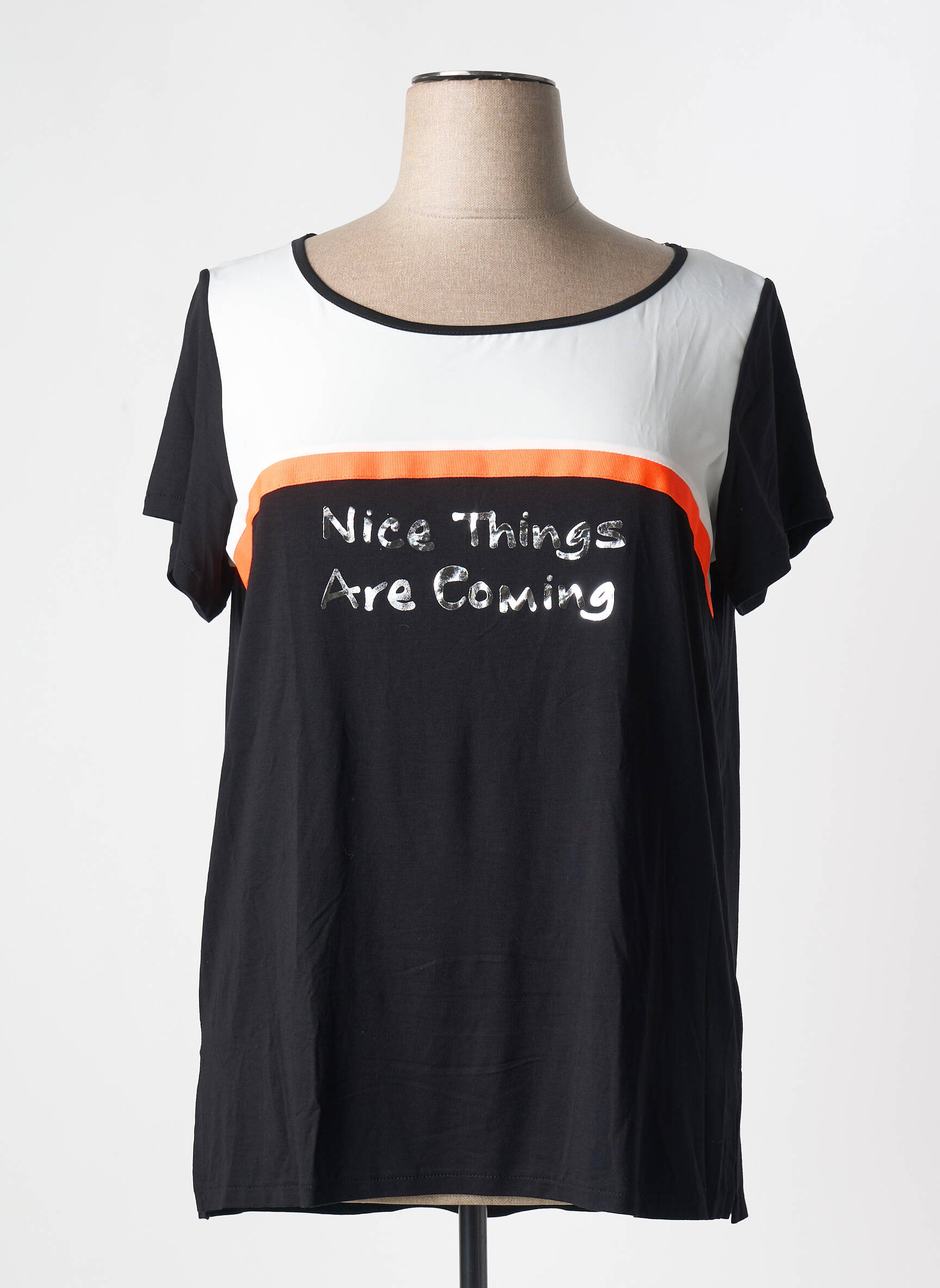 Craquez pour ce T-shirt femme AN II VITO à prix mini, une belle opportunité pour rafraîchir votre dressing sans vous ruiner ! Avec son color-block moderne associant un buste noir contrasté par une encolure blanche, rehaussé d’un liseré orange tendance, il affiche un message positif avec l’inscription "Nice Things Are Coming" pour une touche décontractée et stylée au quotidien. Ce T-shirt allie confort et allure citadine, parfait pour adopter un look dynamique tout en faisant de belles économies.