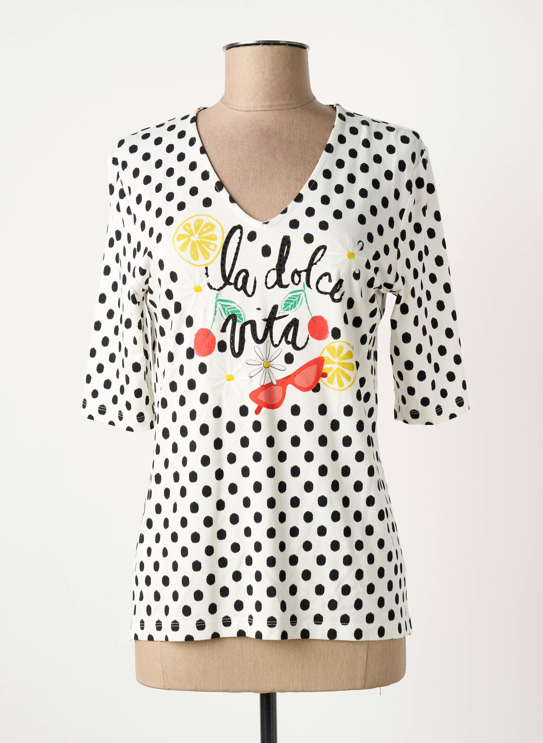 Craquez pour ce T-shirt femme ANANKE à prix mini, idéal pour celles qui aiment renouveler leur dressing sans se ruiner. Son imprimé à pois noir sur fond blanc, rehaussé d'un message "la dolce vita" coloré et fruité, apporte une touche de fraîcheur et d’originalité à toutes vos tenues du quotidien.