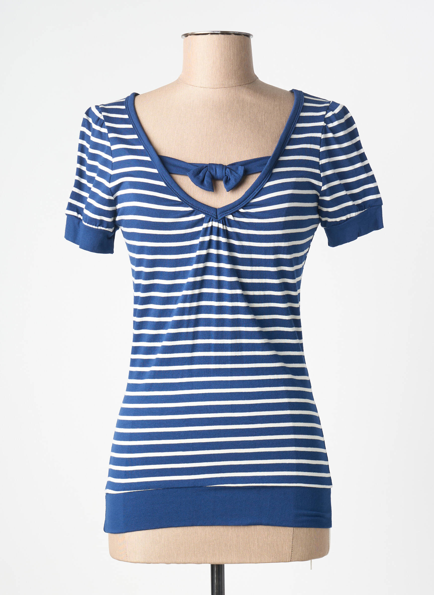 Craquez pour ce T-shirt femme AS DE COEUR à petit prix, une pièce tendance qui séduit par son imprimé rayé bleu et blanc et son joli détail nœud à l’encolure, parfait pour dynamiser vos looks tout en faisant des économies sur votre budget mode.