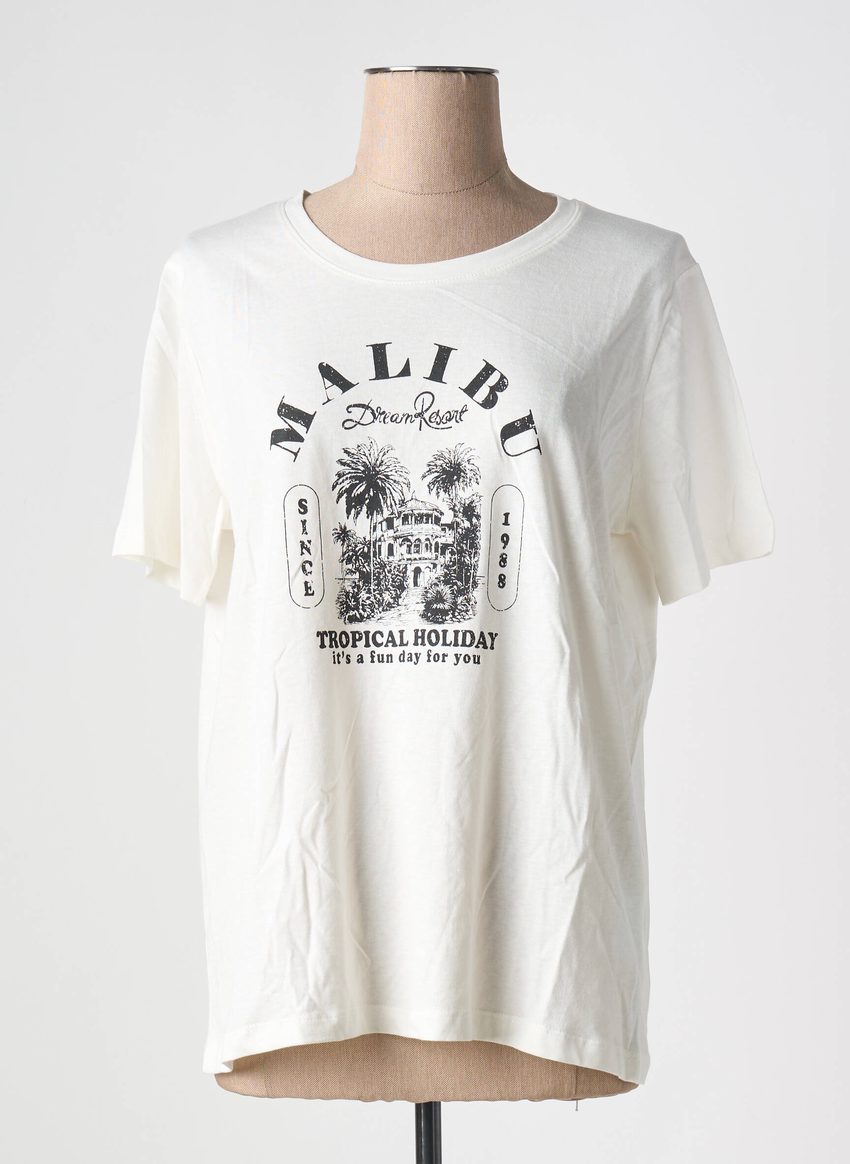 Profitez d'un bon plan mode avec ce T-shirt B.YOUNG pour femme, à petit prix, parfait pour toutes celles qui recherchent le style sans se ruiner. Son coloris blanc lumineux est relevé par un imprimé noir esprit tropical et vintage qui évoque l'ambiance détendue de Malibu, avec son motif palmier et ses inscriptions tendance. Idéal pour donner une touche cool et décontractée à n'importe quelle tenue, ce T-shirt combine confort et style à prix malin, une opportunité à saisir pour renouveler votre dressing sans compromis sur la tendance.