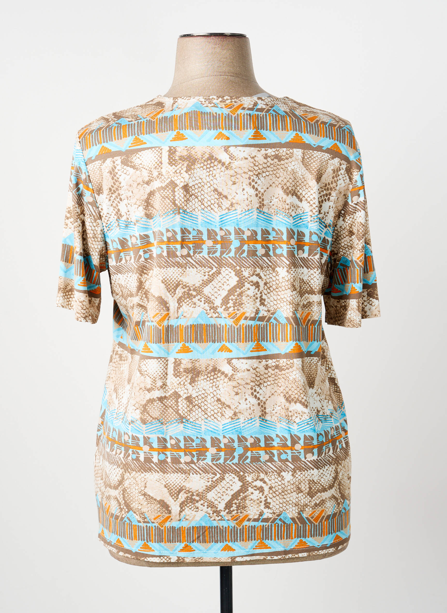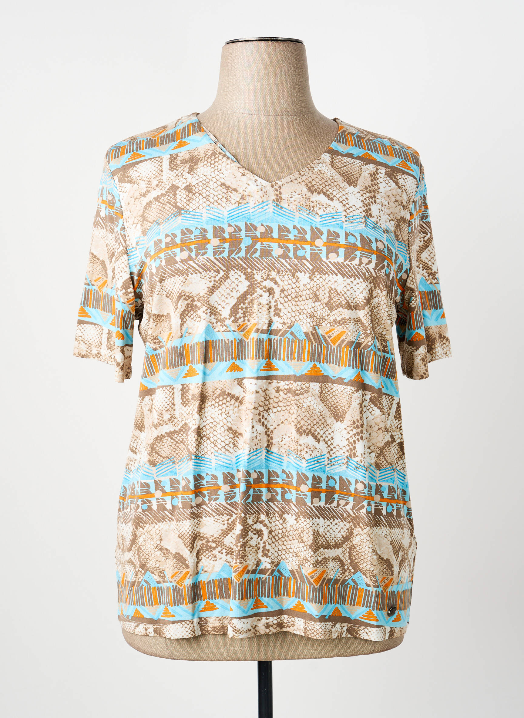 Craquez pour ce T-shirt femme de la marque BARBARA LEBEK, une véritable aubaine pour ajouter une touche d’originalité à votre dressing sans vous ruiner. Son imprimé mêle harmonieusement des tons naturels et des touches de bleu turquoise et d’orange, offrant un look à la fois moderne et facile à porter. Sa coupe confortable et son encolure en V font de ce modèle un incontournable du quotidien, parfait pour celles qui cherchent un style élégant au meilleur prix.