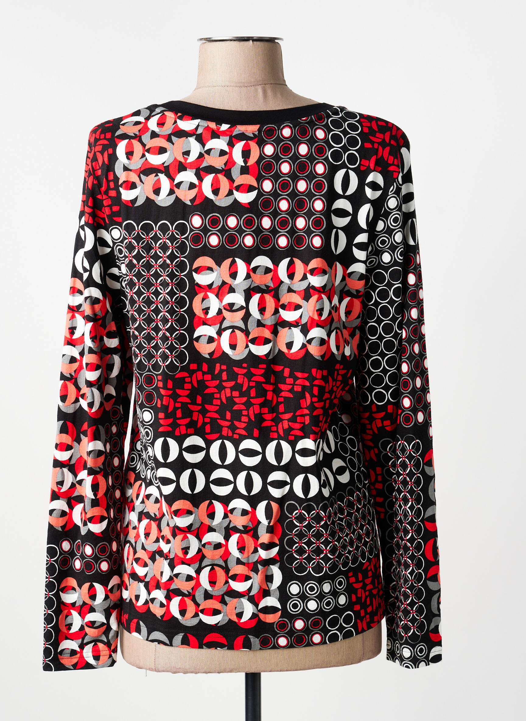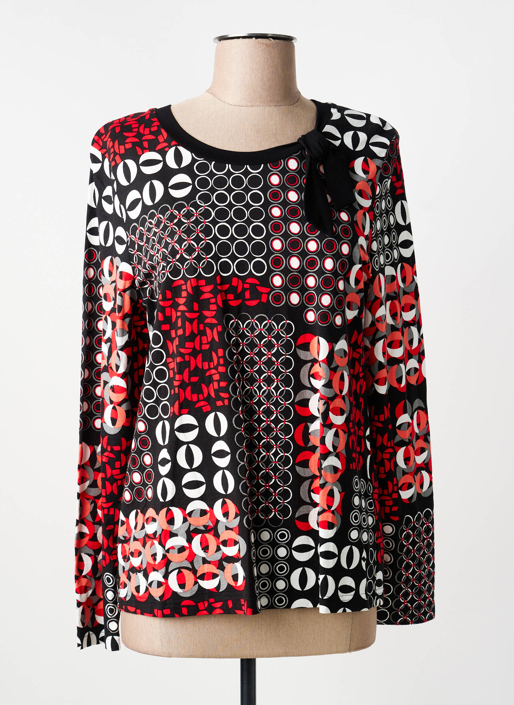 Profitez d’un excellent rapport qualité-prix avec ce T-shirt femme BARBARA LEBEK, idéal pour dynamiser votre garde-robe à petit prix. Son imprimé graphique mêlant rouge, noir et blanc attire le regard et apporte une vraie touche de modernité à votre look, tandis que le petit nœud à l’encolure ajoute une note féminine pleine de charme. C’est le bon plan parfait pour égayer votre style sans se ruiner.