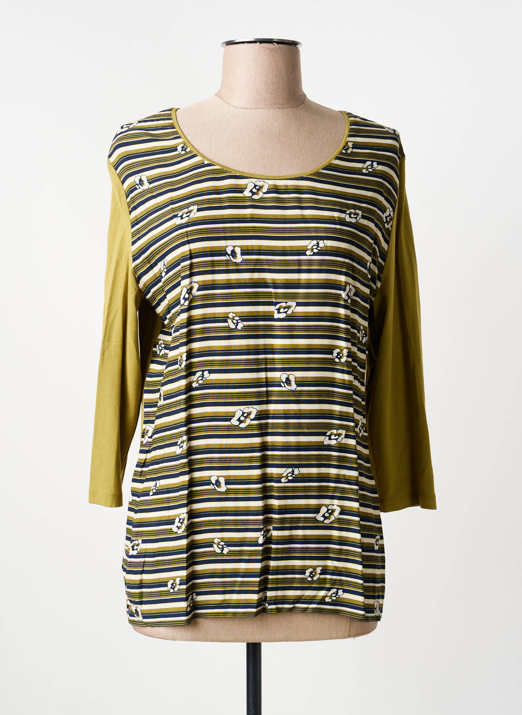 Profitez d'une belle opportunité avec ce T-shirt BARBARA LEBEK pour femme, à petit prix, qui allie style et originalité avec son élégant jeu de rayures multicolores et ses motifs fleuris discrets sur le devant. Les manches trois-quarts unies d'une teinte jaune moutarde ajoutent une touche de modernité idéale pour dynamiser vos tenues du quotidien sans vous ruiner. C’est le compromis parfait entre qualité et bon plan pour renouveler votre dressing à moindre coût.