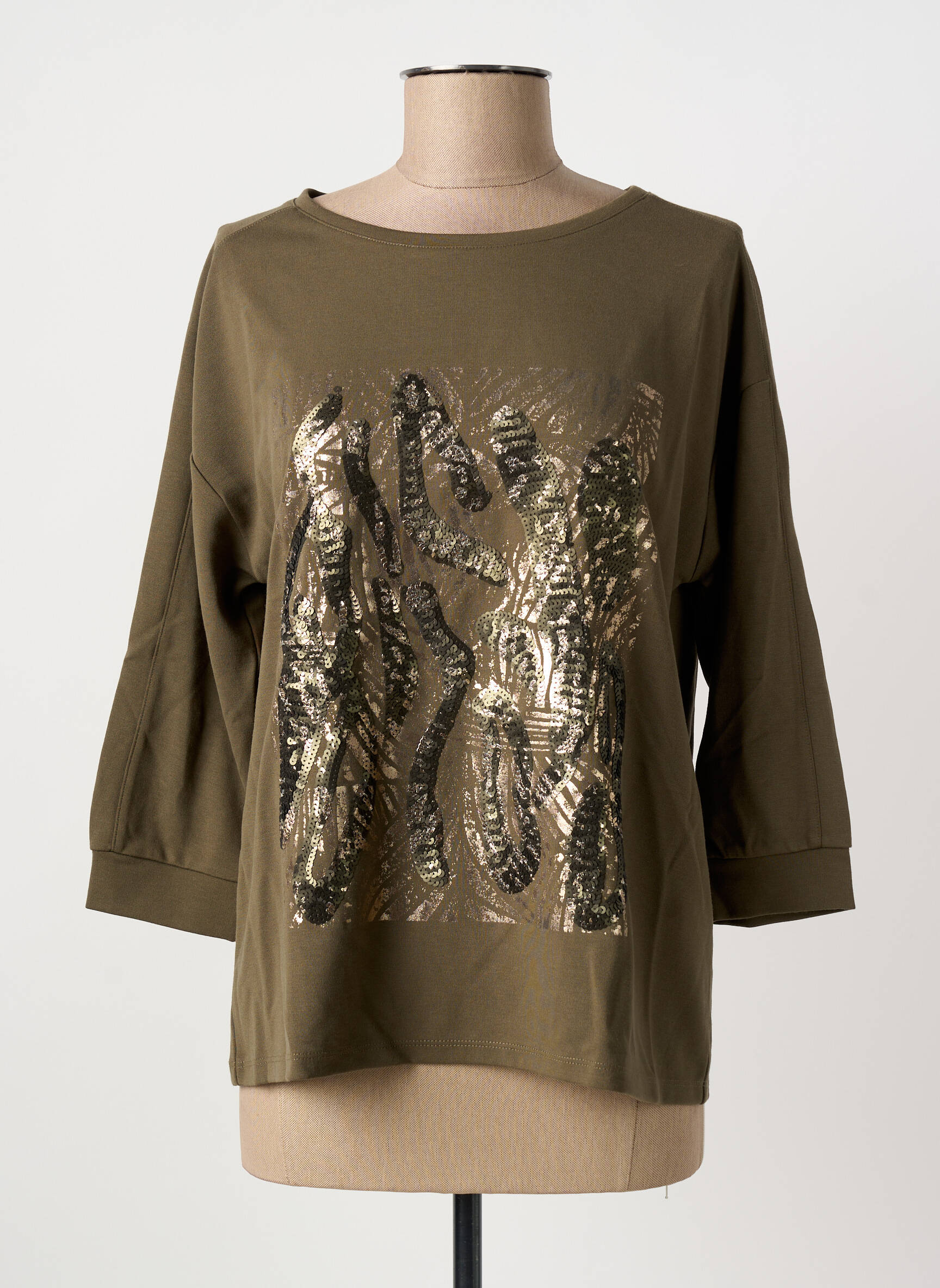 Profitez d'un bon plan mode avec ce T-shirt BETTY BARCLAY pour femme, parfait pour ajouter une touche tendance à votre dressing sans vous ruiner. Sa couleur kaki sophistiquée s’associe à un motif original effet brillant sur le devant, pour un style unique et facile à porter au quotidien. Ses manches trois-quarts et sa coupe ample offrent un confort optimal tout en soulignant l’élégance décontractée de la pièce, idéale pour profiter d’une allure chic à prix mini.