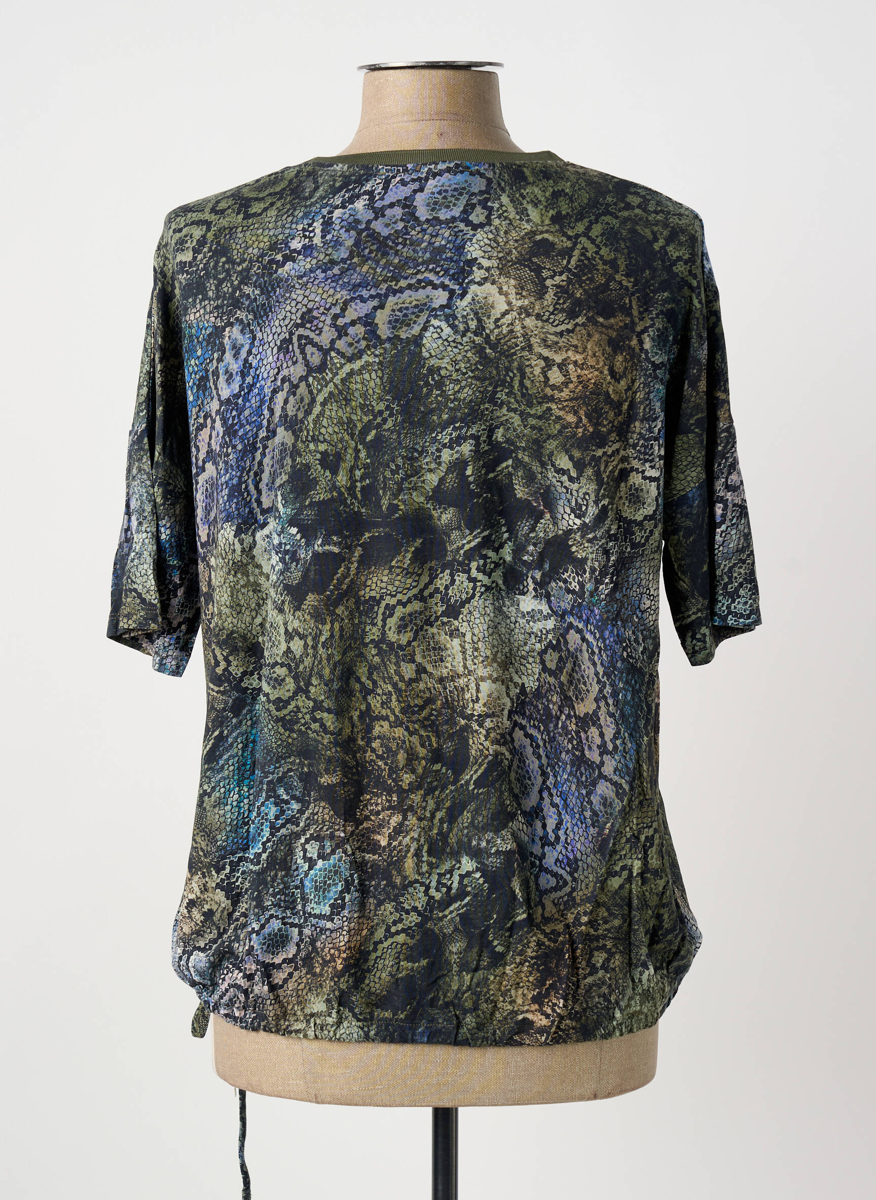 Offrez-vous un look tendance sans vous ruiner avec ce T-shirt BETTY BARCLAY pour femme, affichant un imprimé all-over façon python dans des tons bleu, kaki et doré, rehaussé d’un message en velours floqué pour une touche mode. Sa coupe légèrement ample, sublimée par un lien à nouer sur le bas, vous garantit confort et originalité à prix malin sur notre site de déstockage multi-marques.