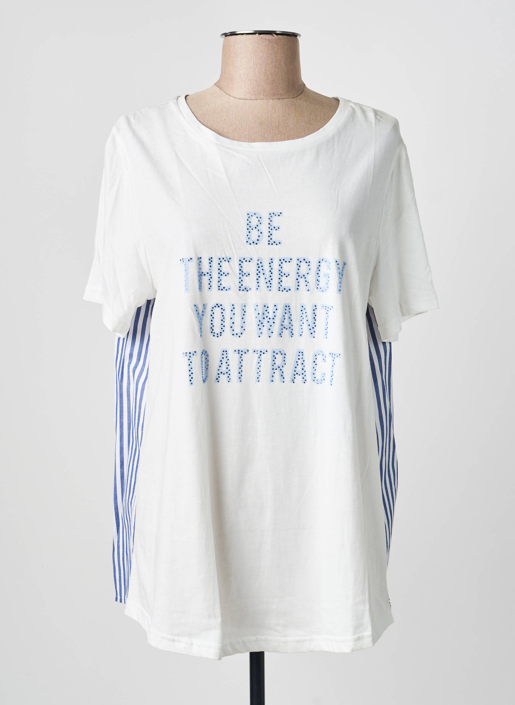 Craquez pour ce T-shirt BOCETTO pour femme à prix mini, parfait pour ajouter une touche tendance à votre dressing sans vous ruiner. Avec son message inspirant "Be the energy you want to attract" sur fond blanc, il se distingue par ses détails rayés bleus sur les côtés qui apportent une note originale et moderne. Sa coupe décontractée en fait une pièce facile à porter au quotidien, idéale pour toutes celles qui recherchent un basique stylé à petit prix.