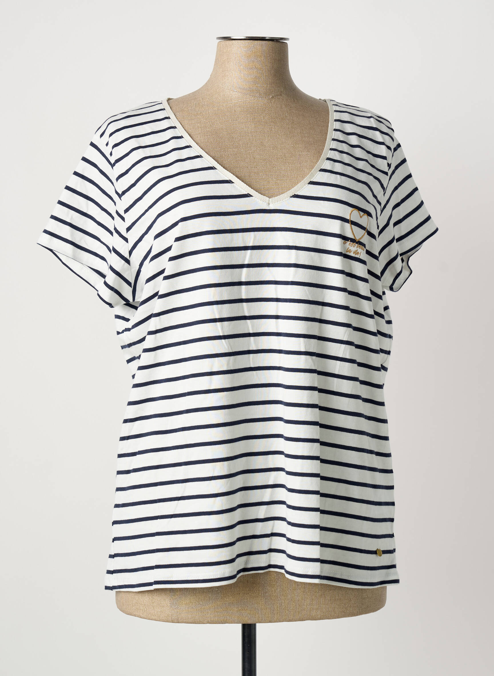 Craquez pour ce T-shirt C'EST BEAU LA VIE à prix de rêve, idéal pour rafraîchir votre dressing sans vous ruiner. Sa coupe fluide et son col en V dévoilent une allure féminine et décontractée, tandis que les fines rayures marines sur fond blanc offrent un style intemporel et facile à accorder. Un discret motif doré vient souligner la poitrine avec une touche lumineuse et tendance, parfait pour profiter d’un look chic à petit prix.