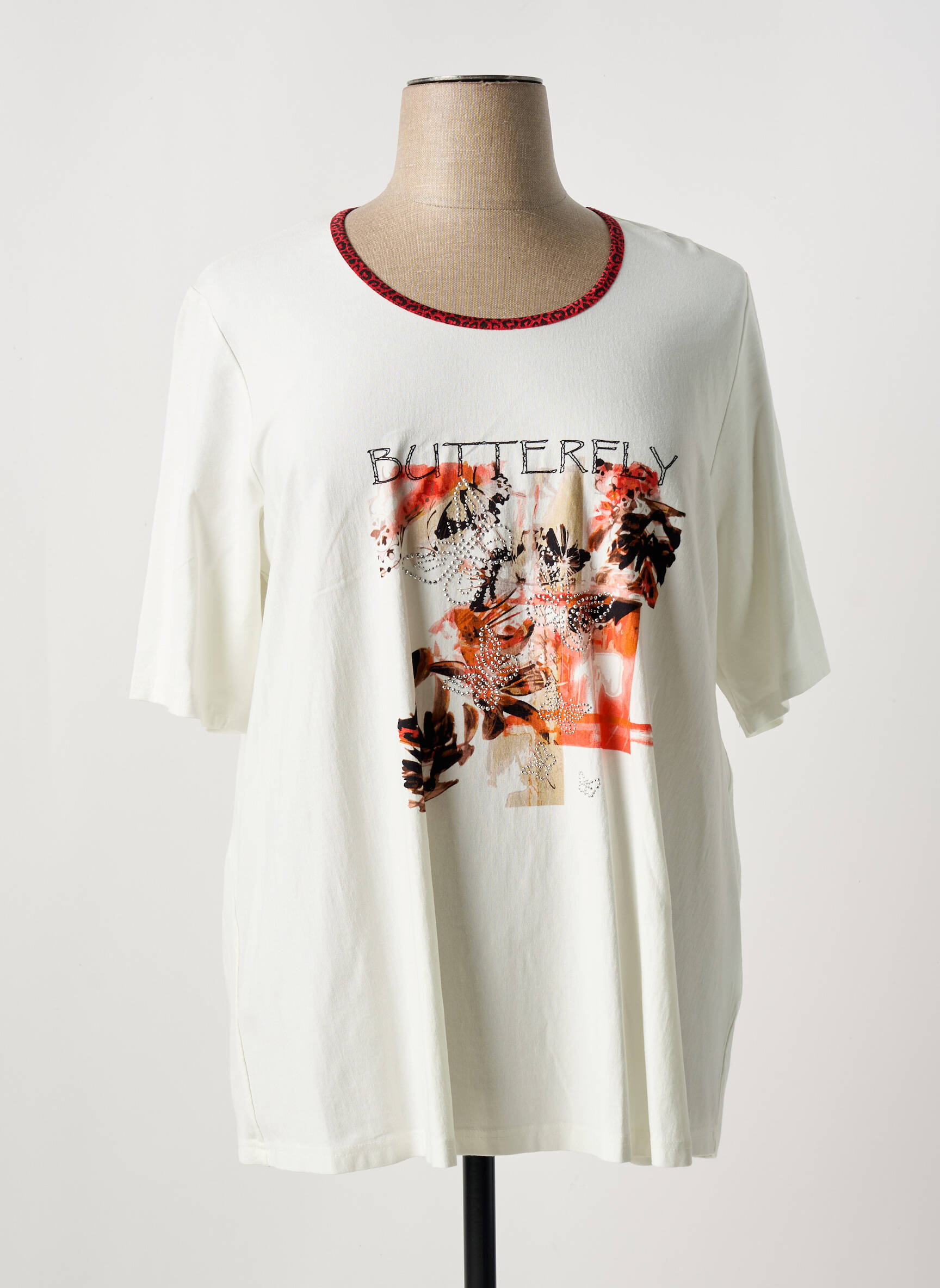 Ce T-shirt femme de la marque CHALOU est une véritable opportunité pour rafraîchir votre garde-robe à petit prix, sans renoncer au style. Son fond blanc lumineux est rehaussé d’un imprimé papillon et floral dans les tons orangés et bruns, idéal pour apporter une touche de douceur à votre quotidien. Le col rond orné d’un liseré rouge ajoute une note d’originalité, parfait pour celles qui aiment les détails soignés. Profitez d’un T-shirt tendance et confortable, à prix déstocké, pour une allure moderne sans vous ruiner.