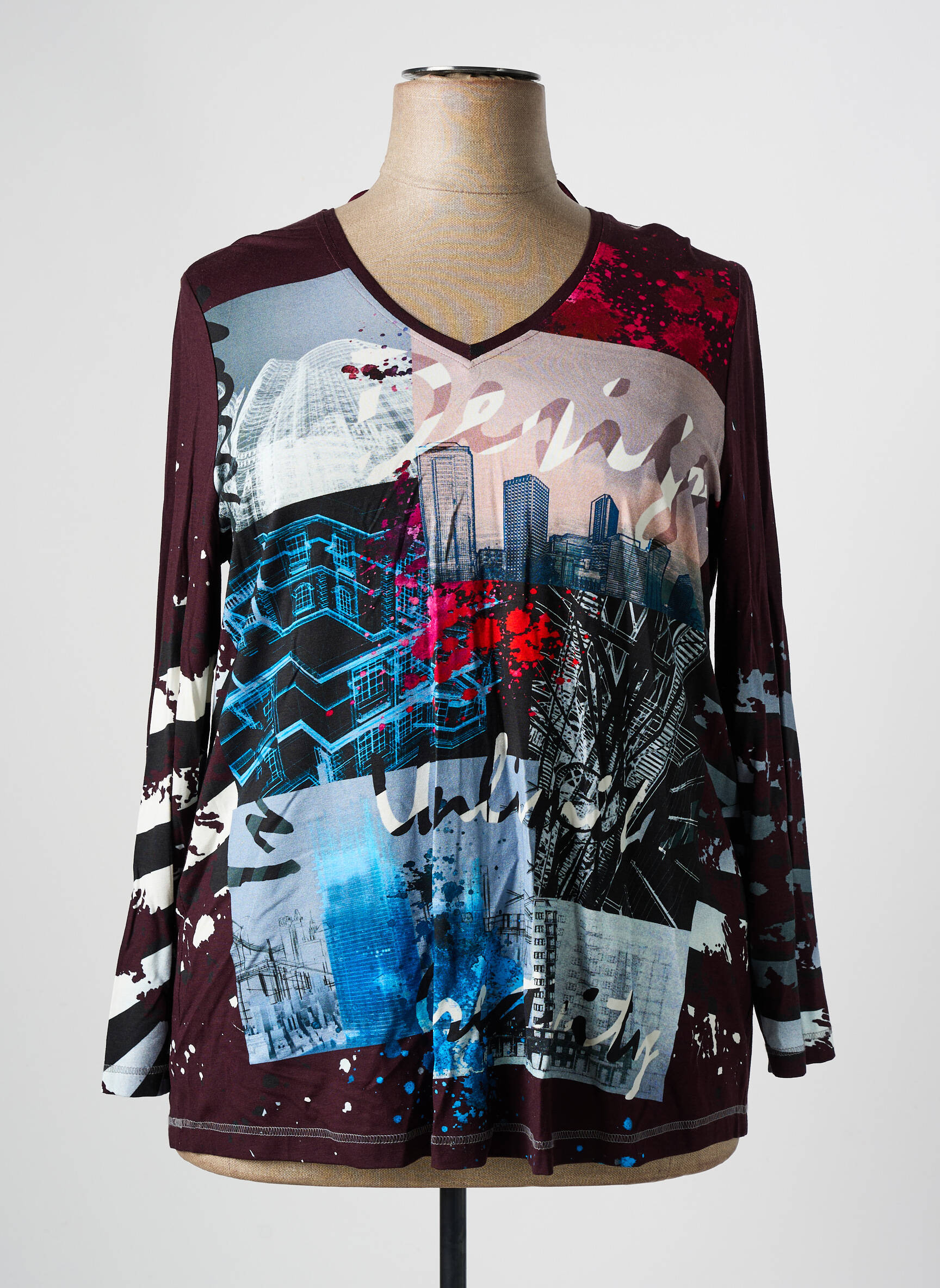 Craquez pour ce T-shirt femme de la marque CHALOU à prix cassé, une véritable opportunité pour donner du style à votre garde-robe sans vous ruiner. Son imprimé artistique mêlant motifs urbains, touches de bleu, de rouge et de blanc sur fond bordeaux apporte une originalité tendance, tandis que la coupe confortable et les manches longues en font un allié parfait pour tous les jours. Succombez à ce bon plan mode qui combine allure contemporaine et petit prix, idéal pour renouveler votre look avec une pièce unique et dynamique.