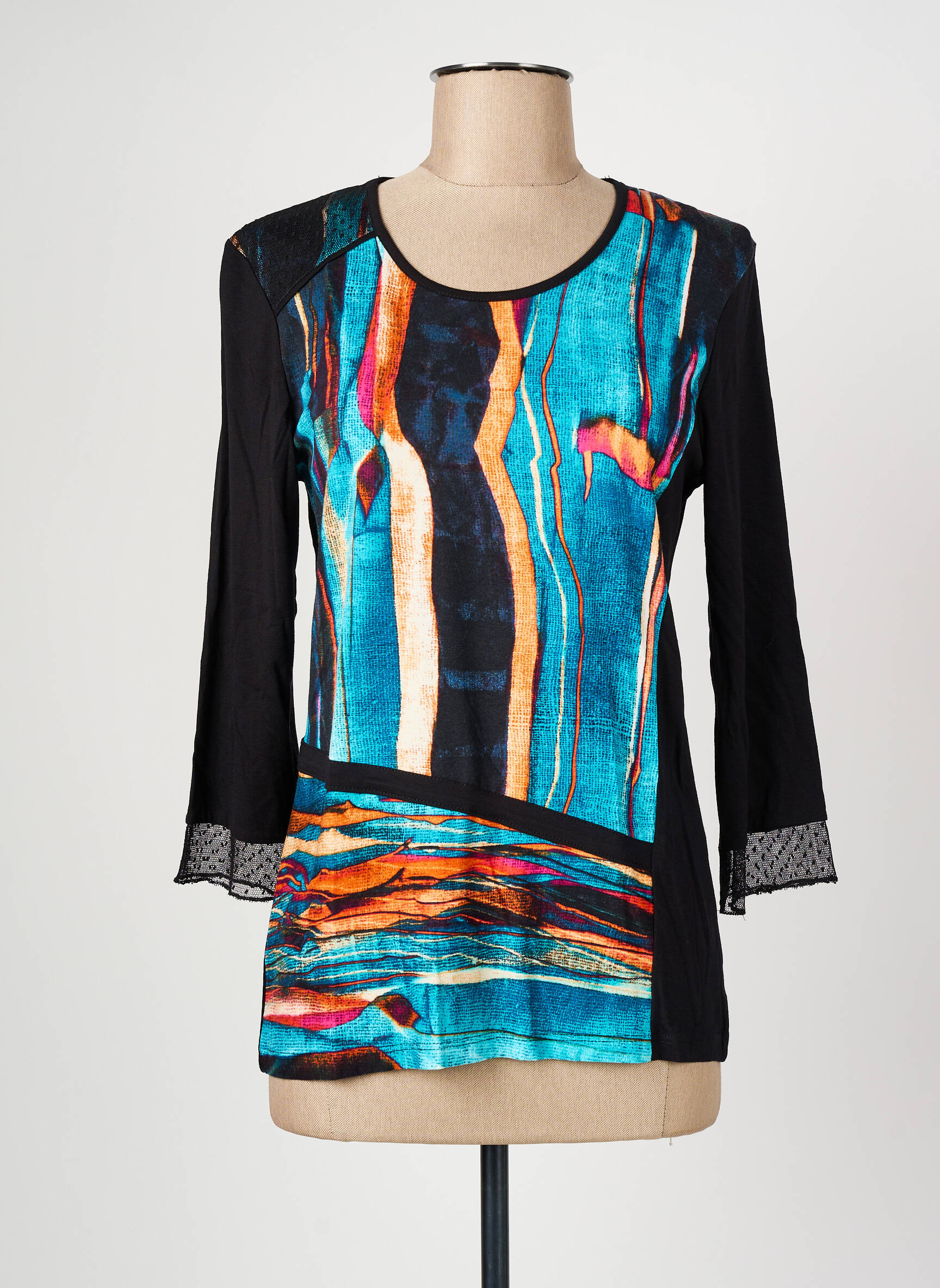 Profitez d’un vrai bon plan avec ce T-shirt CHRISTINE LAURE pour femme, qui combine style et économies. Il séduit au premier regard avec son imprimé artistique aux nuances de bleu, orange et noir, offrant une touche d’originalité à votre garde-robe. Les manches longues noires, légèrement transparentes sur les poignets, ajoutent une note élégante à cette pièce facile à porter au quotidien. Saisissez l’occasion de dénicher ce modèle tendance à petit prix, idéal pour apporter du peps à vos tenues sans vous ruiner.