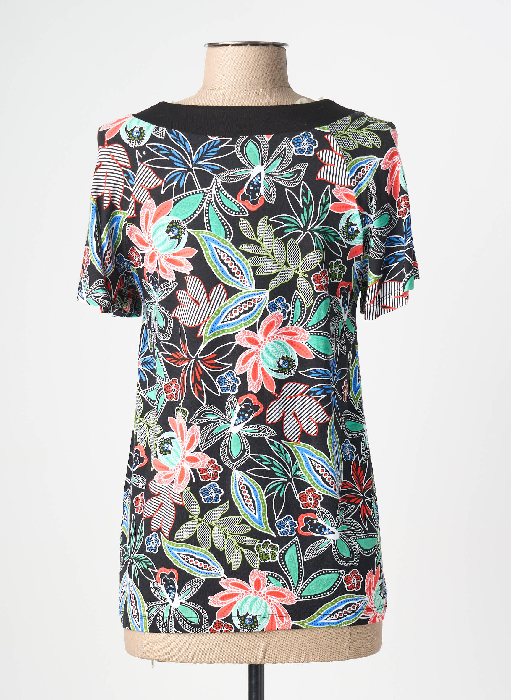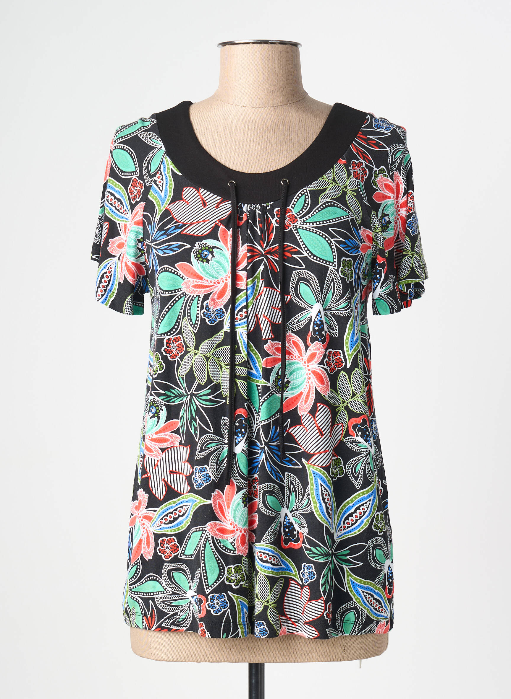 Profitez d’un vrai bon plan avec ce T-shirt femme de la marque CHRISTINE LAURE, qui allie élégance et petits prix. Son imprimé floral coloré apporte une touche de fraîcheur à votre tenue, tandis que l’encolure ronde rehaussée d’un détail lien ajoute une note moderne et féminine. Ce modèle offre un tombé confortable et une coupe facile à vivre, parfait pour dynamiser votre dressing à moindre coût.