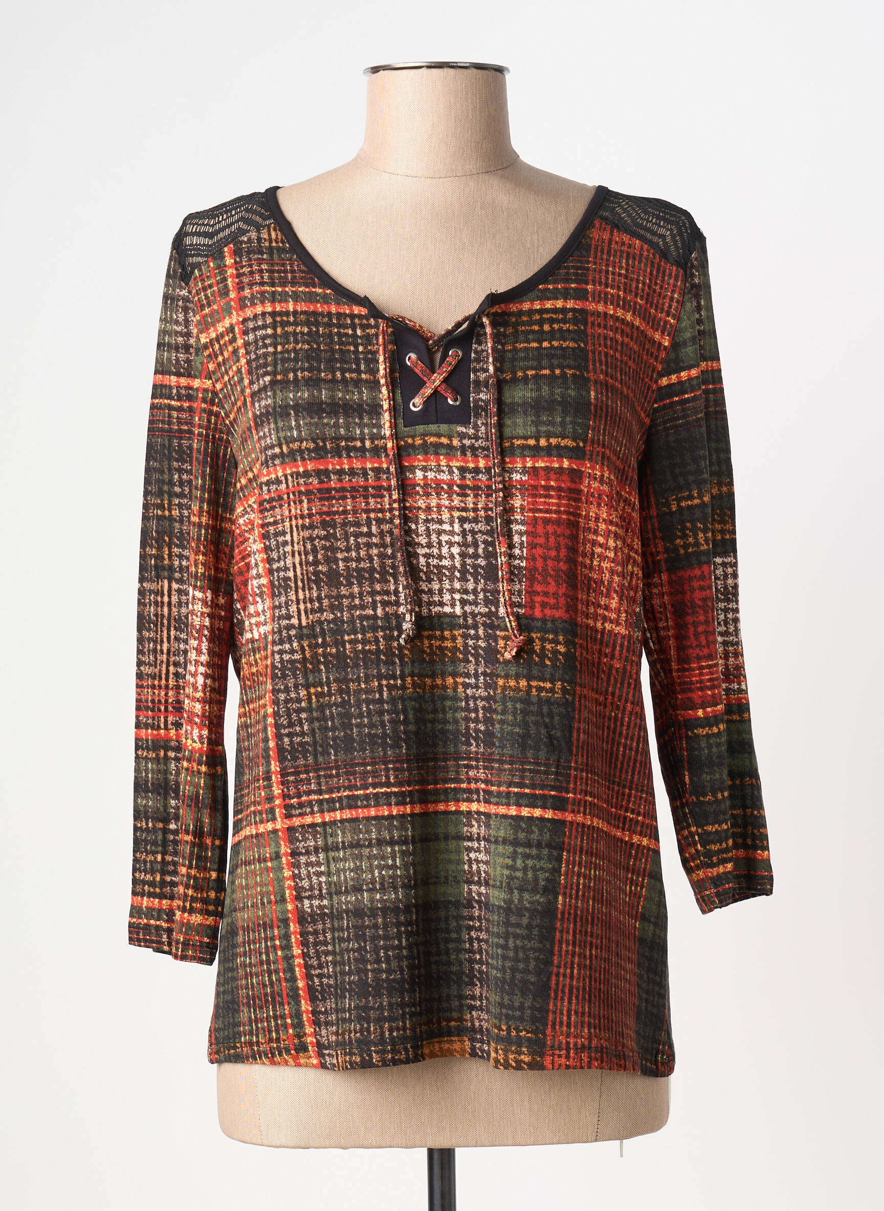 Profitez d’un vrai bon plan avec ce T-shirt CHRISTINE LAURE pour femme, parfait pour apporter une touche d’originalité à votre tenue sans vous ruiner. Son motif à carreaux revisité dans des tons chauds et élégants, associé à un col en V féminin agrémenté d’un joli laçage, fait de ce haut un choix malin pour renouveler votre garde-robe à petit prix. Idéal pour un look casual chic, ce T-shirt à manches longues offre style et confort tout en vous permettant de réaliser de belles économies.