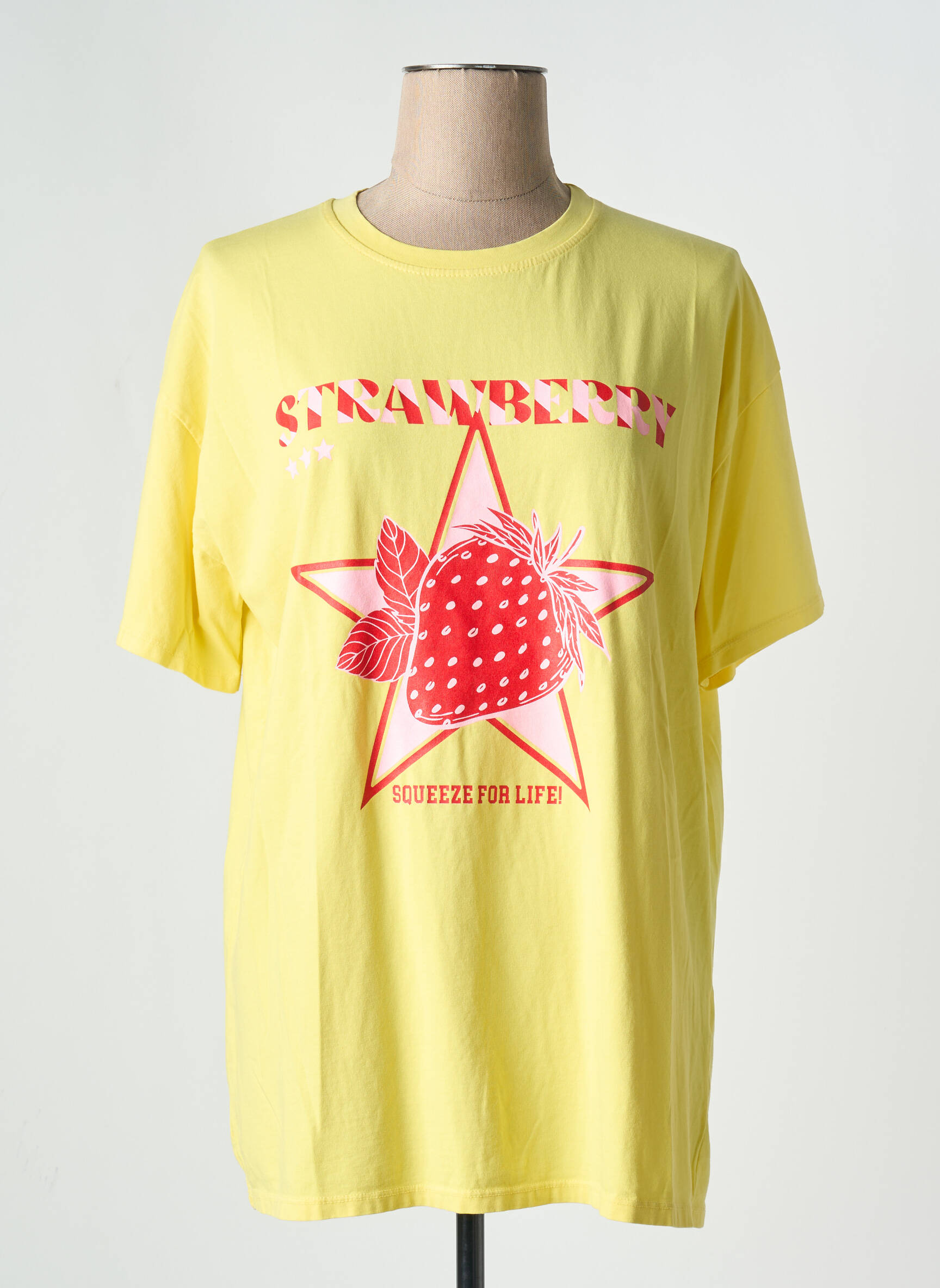 Craquez pour ce T-shirt CIAO MILANO pour femme, un véritable bon plan mode pour celles qui veulent dynamiser leur dressing sans se ruiner. Avec sa couleur jaune éclatante et son imprimé “STRAWBERRY” accompagné d'une fraise rouge au centre d’une étoile, il apporte instantanément une touche vitaminée et tendance à vos looks du quotidien. L’inscription “Squeeze for life” ajoute une note fun et décontractée, parfaite pour une allure estivale et moderne à prix mini.