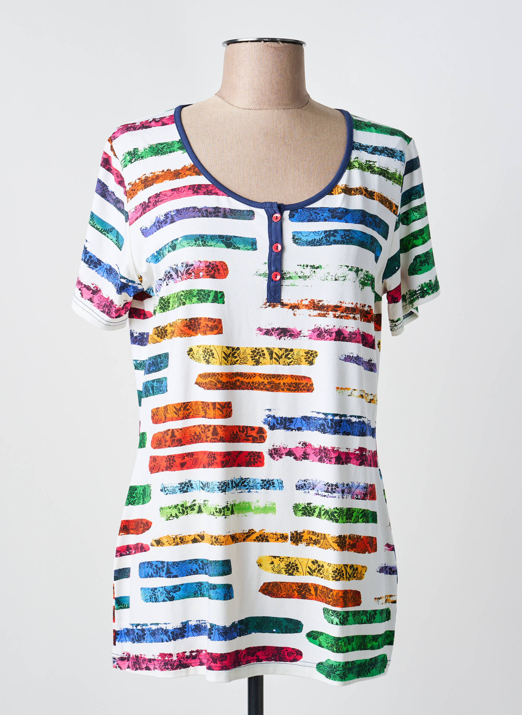 Profitez d’une véritable affaire avec ce T-shirt femme signé CLAUDE DE SAIVRE, parfait pour ajouter une touche de couleur à votre dressing sans vous ruiner. Son imprimé multicolore apporte une note dynamique et originale, tandis que sa coupe féminine à encolure arrondie et patte de boutonnage valorise la silhouette avec simplicité. Grâce à ses finitions soignées et son confort au quotidien, il s’impose comme le choix malin pour renouveler son style à petit prix.