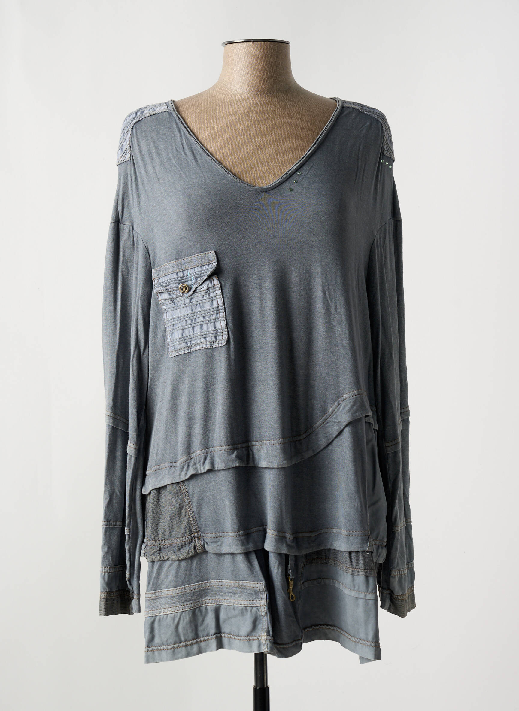 Imaginez un vêtement qui mêle à la fois douceur et audace, ce T-shirt pour femme de la marque ELISA CAVALETTI réinvente la simplicité avec sa coupe déstructurée et ses détails subtils. Conçu dans un gris fumé, il joue avec des superpositions délicates mêlées à des finitions légèrement effilochées qui apportent une touche bohème et authentique. Son col en V profond crée un effet d’ouverture élégant, tandis que la petite poche plaquée ornée de boutons sur la poitrine vient casser la sobriété avec une note décalée et inspirée. Les épaules sont soulignées par des empiècements texturés qui ajoutent du caractère à ce modèle à manches longues, parfait pour un style casual-chic tout en confort et modernité.