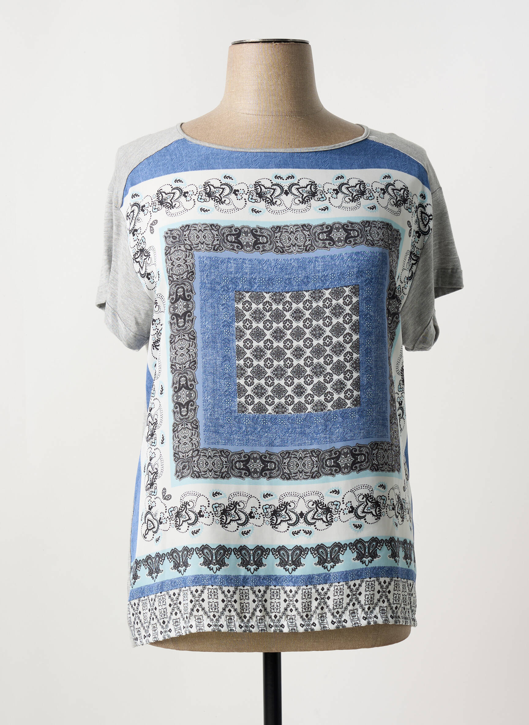 Profitez d’un vrai bon plan avec ce T-shirt femme ESCORPION, qui combine élégance et petit prix. Son motif carré façon foulard mêle harmonieusement différentes teintes de bleu et de gris sur fond clair, pour une touche originale mais facile à porter au quotidien. Les manches courtes et la coupe droite offrent un confort parfait, tandis que le design raffiné apporte la touche mode idéale pour sublimer toutes vos tenues sans vous ruiner.