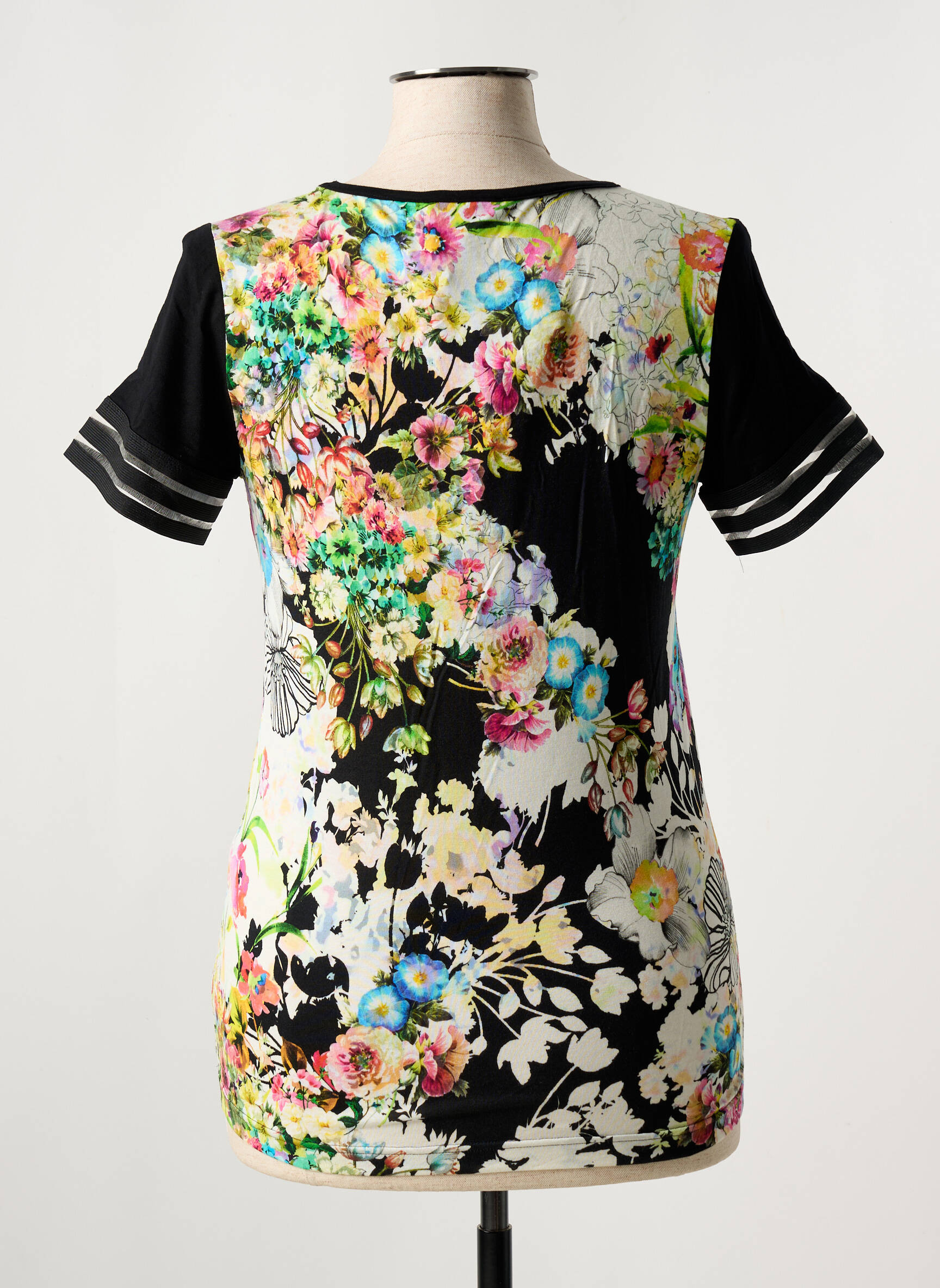 Profitez d’un vrai bon plan avec ce T-shirt FILIPINE LAHOYA pour femme qui combine élégance et originalité à petit prix. Son imprimé fleuri éclatant, subtilement contrasté par un fond noir et rehaussé de manches courtes à rayures transparentes, apporte une note chic et tendance à votre garde-robe, idéal pour apporter une touche de couleur à vos tenues sans vous ruiner.