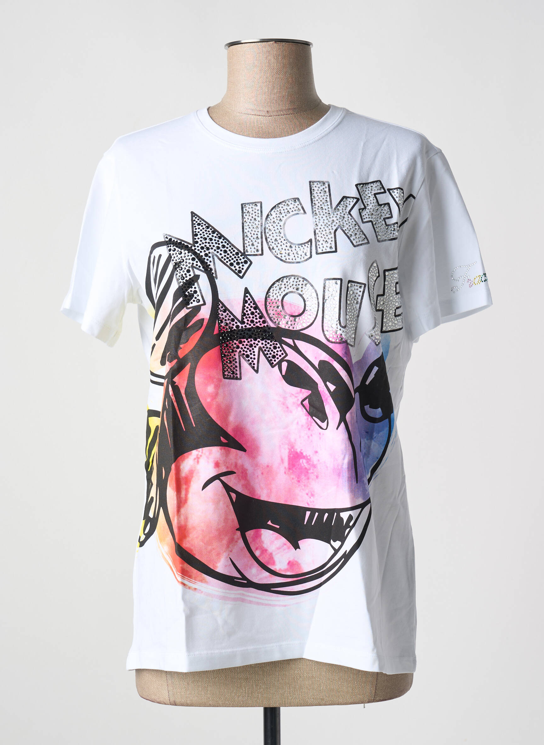 Imaginez votre journée s'illuminer dès le premier regard grâce à ce T-shirt FRACOMINA pour femme qui mêle avec audace un blanc éclatant à un imprimé coloré et graphique de Mickey Mouse. Le visage iconique du personnage se déploie en grand format sur le devant, relevé par des touches artistiques en dégradé rose, jaune et bleu qui apportent une énergie résolument moderne à ce classique revisité. Sa coupe simple et confortable accompagne parfaitement ce motif joyeux, faisant de ce T-shirt une pièce phare pour exprimer une personnalité à la fois détendue et pleine de peps.