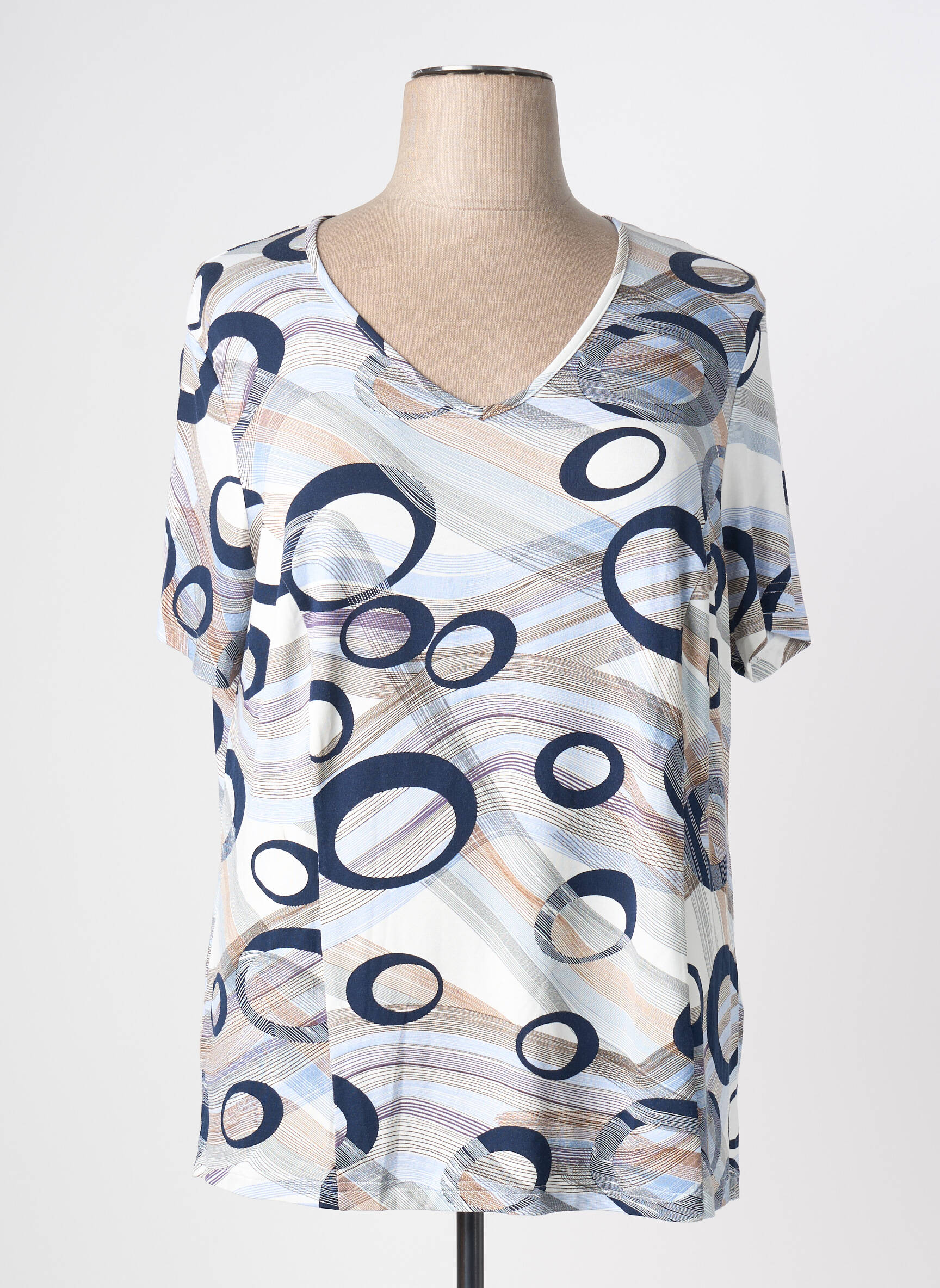 Profitez d’une occasion à ne pas manquer avec ce T-shirt France Rivoire pour femme, idéal pour celles qui recherchent à la fois style et petits prix. Son motif graphique mêlant cercles bleus et touches pastel apporte une note moderne et originale à votre look, tandis que sa coupe droite avec encolure en V assure un confort au quotidien. Ce T-shirt tendance est le choix parfait pour se faire plaisir sans se ruiner.